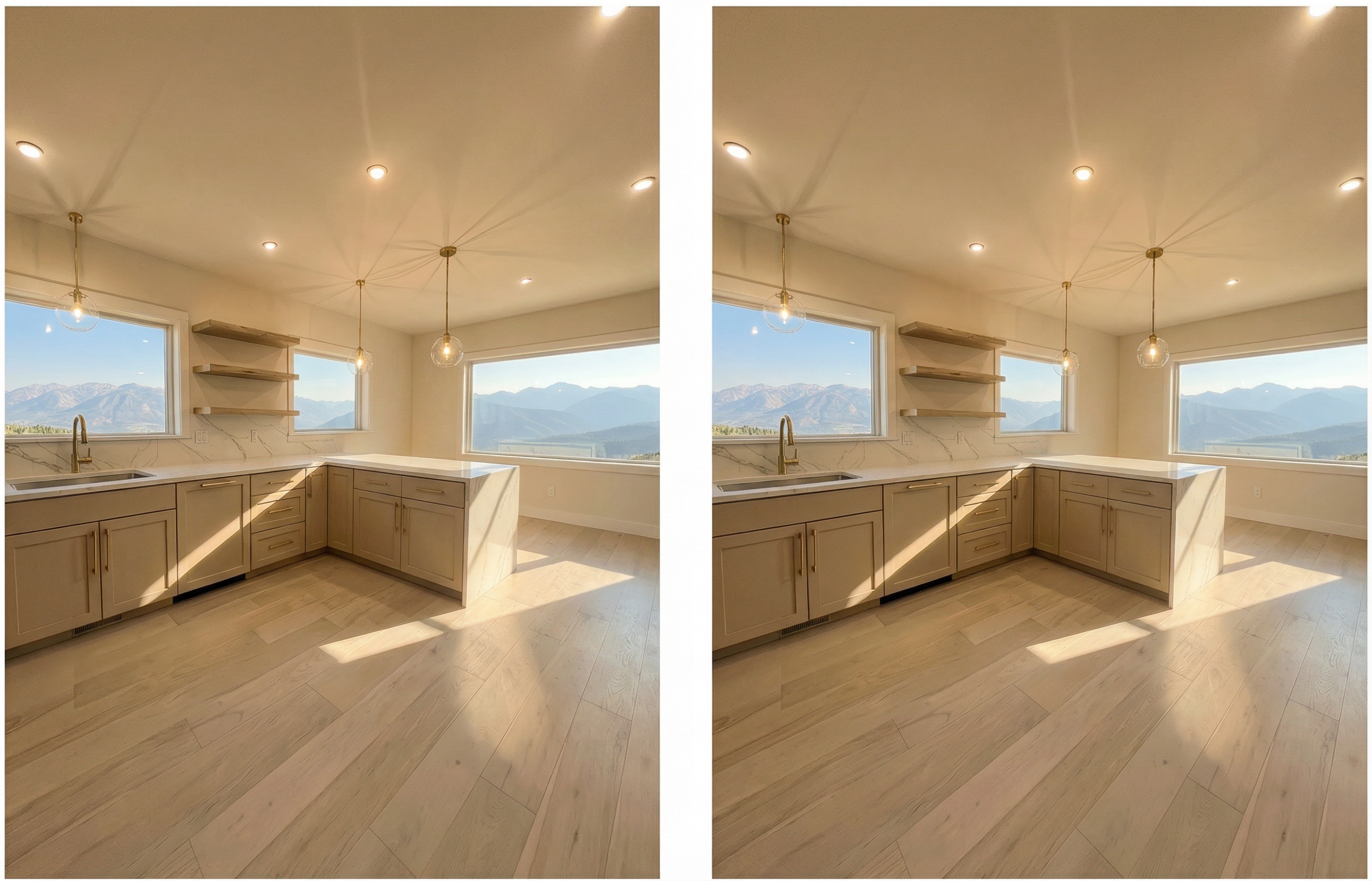 render this image transforming it into an architectural photo the building s exterior cladding is wood while the columns and perimeter wall railing are corten steel the sunshades are corten steel add reflections to the windows and the glass parapet the window frames are dark black aluminum the perspective allows you to see a one way street on the right while on the left a house hidden by trees while in the front you can glimpse a road and trees that give the building a sense of privacy also position some cars to create the effect of movement and people please do not alter the image or the framing do not distort anything