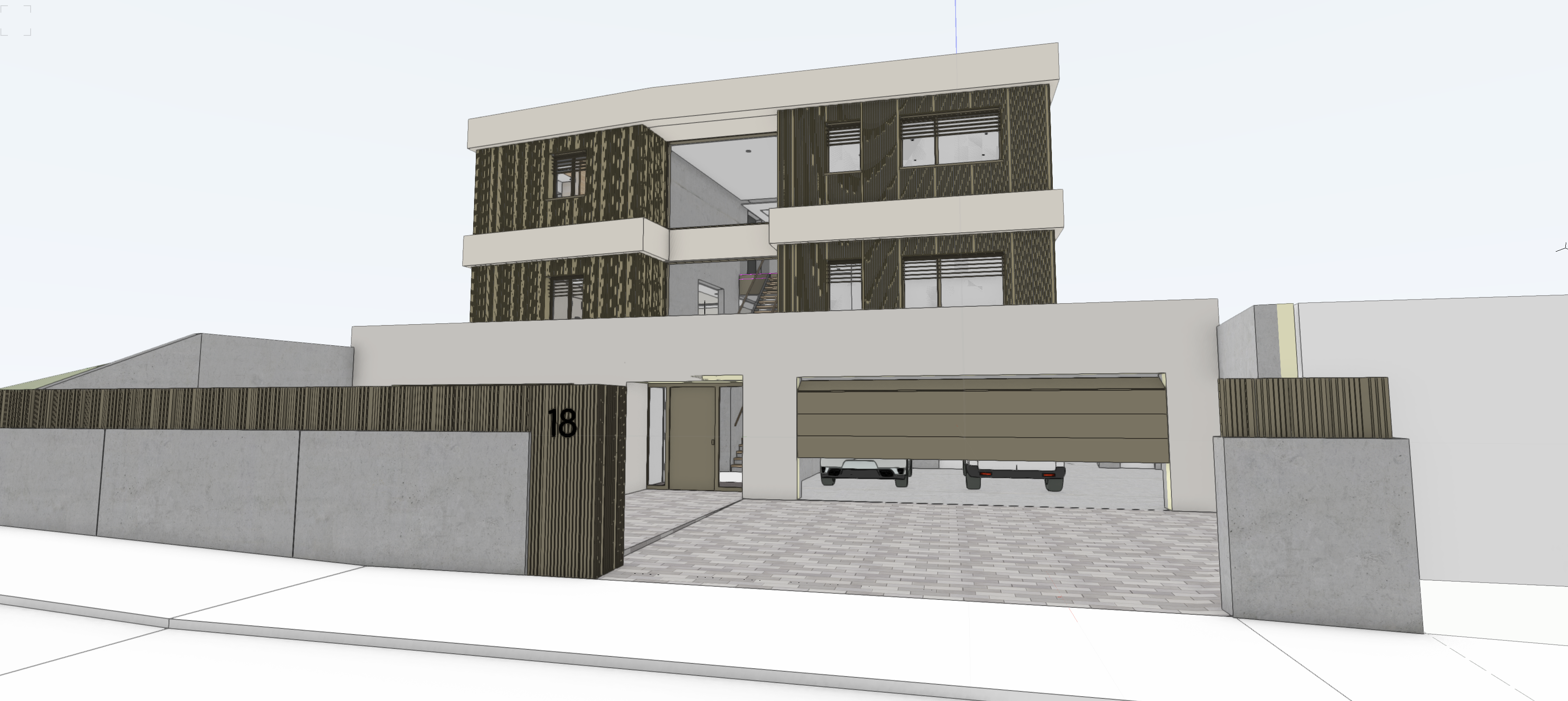 render a modern three story house with a warm inviting atmosphere use brushed bronze textures for the exterior panels and a contrasting light beige for horizontal elements the garage door should be a sleek medium taupe include elegant gray concrete for the fence and driveway tiles with subtle texture the windows are large adding transparency and lightness set the scene under a bright blue sky enhancing the contemporary aesthetic