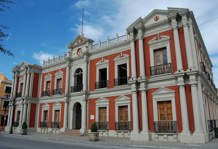 presidencia municipal antigua de color beige con acentos rojos puertas color chocolate y herreria negra