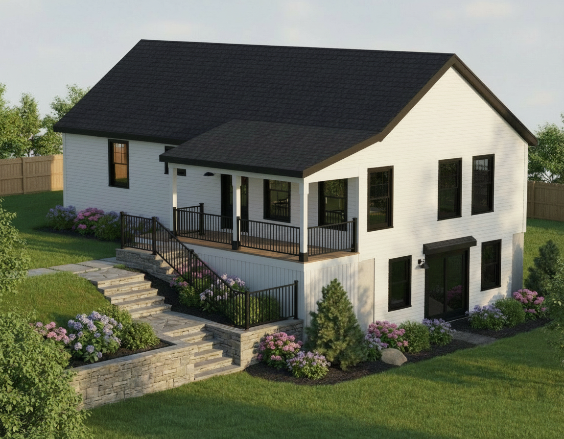 place the black wrought iron railing along the outer edge of the stairs following the natural slope and flow of the stair line the railing must run continuously along the stair edge and not be positioned in the middle of the stair treads all posts should sit at the edge of the masonry stair structure aligned with the retaining wall use a clean modern wrought iron style with vertical balusters and a matte black finish maintain realistic lighting perspective and scale do not change the stairs or landscaping starting from the deck corner match the deck railing to the rod iron there should be 3 sections connected top of the stairs to the landing across the landing from landing to the bottom of the stairs