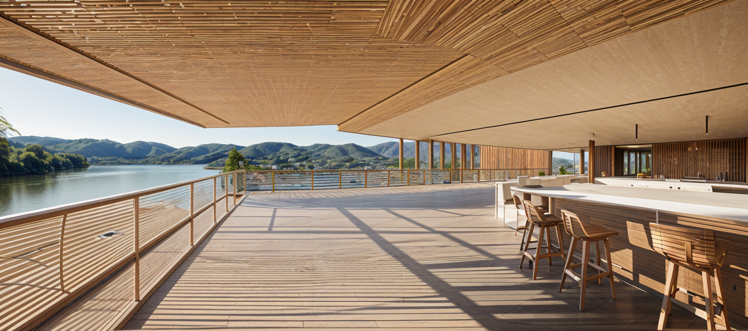 kengo kuma wide angle shot design restaurant bohemian chic atmosphere and style featuring lamps stylish design elements tables in light beige plants view mountain ard che architecture