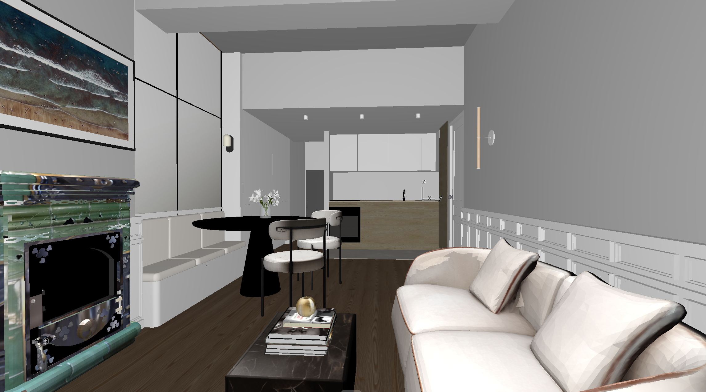 keep everything identical to the reference render replace the wall on the right the one with the cross detail with a mirror same proportions and reflections consistent with the room the lower part of the kitchen cabinets must be in light oak wood keep all other materials colors and lighting exactly the same ultra realistic render