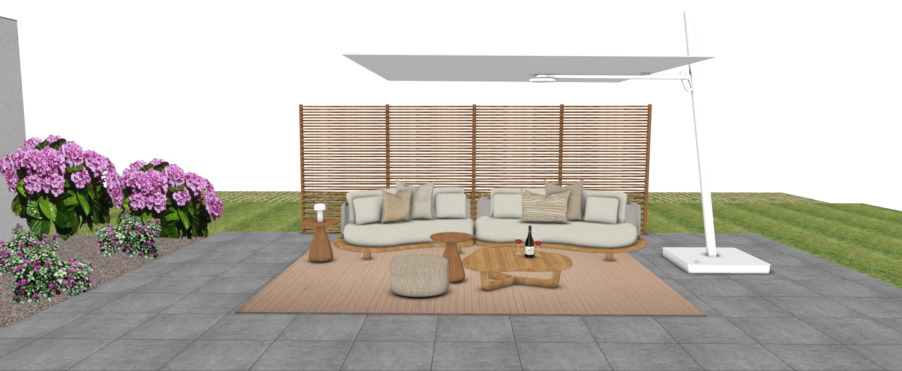 realistic garden with warm natural daylight realistic background with modern houses hedge between neighbours keep colors textures and proportions sun at terrace middle grey tiles