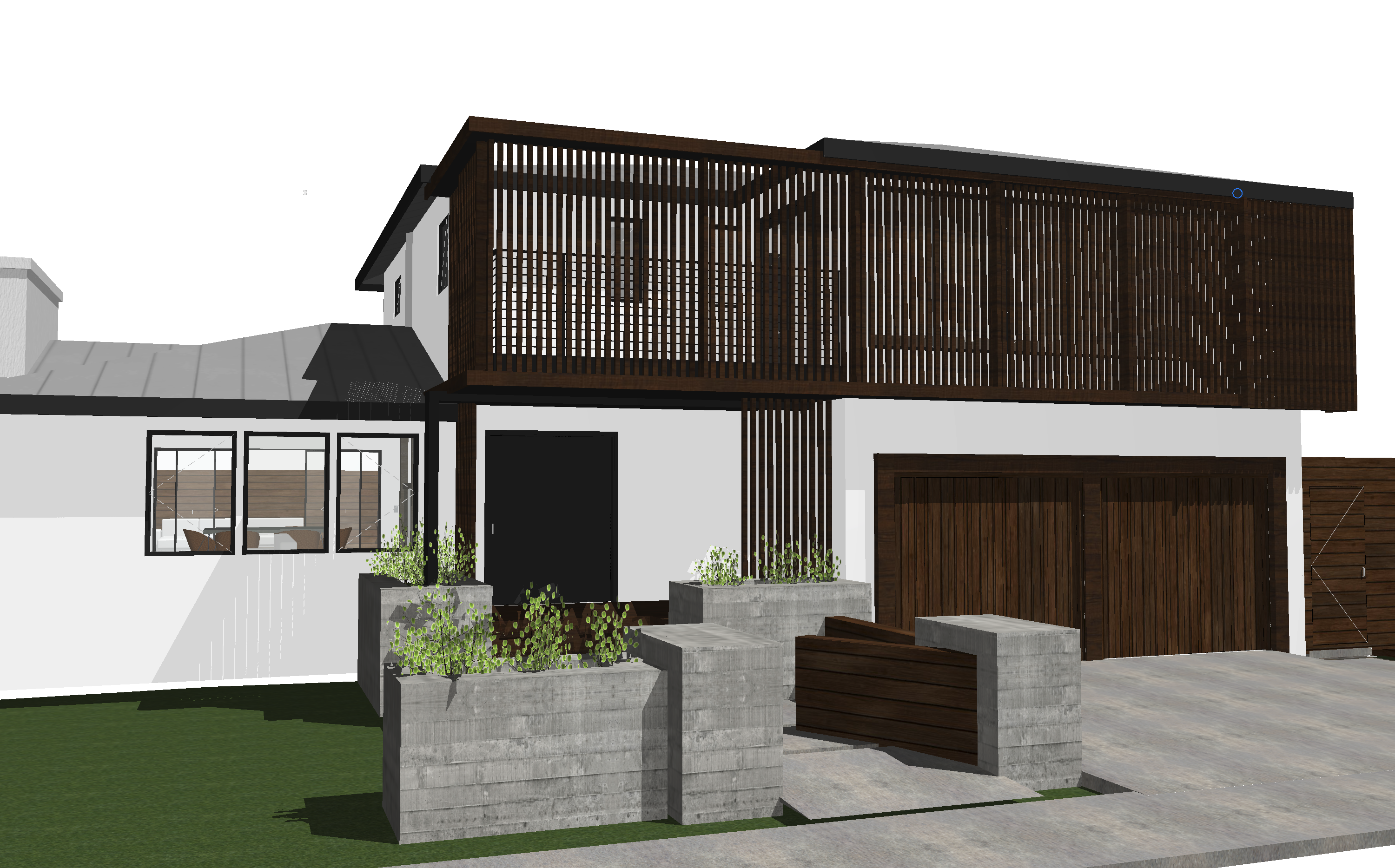 the screens can be more closed and slid across the windows and the front of the balcony the screens in front of the balcony can partially slide to the right as well the roof needs to be black standing seam metal the wall at the entry door needs to be dark wood the time of day needs to be twilight the lighting inside needs to glow to show the master bedroom through the wooden screens there needs to be a porch light there needs to be a grey tesla in the driveway with a woman wearing athleisure wear walking into the house lots of vegetation in the front yard low growing the front walls near the sidewalk need to be a concrete wall instead of stone the front door needs to be a large modern pivot door that matches the exterior wall around it being dark wood