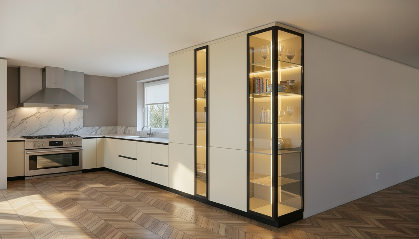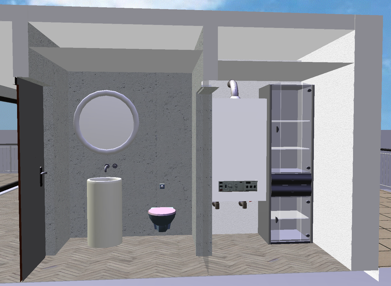 genau dieses rendering berarbeiten fotorealistisches innenraum foto exakt dieselbe perspektive und kameraposition wie das hochgeladene referenzbild 100 identische raumgeometrie exakt gleiche m belanordnung exakt gleiche verlegeart und richtung von parket wie vorlage parket ruhig und hellgrau weiches nat rliches tageslicht raum k nstlich ausleuchten sanfte realistische schatten realistische materialien echte holztexturen hochwertige oberfl chenreflexionen lavabo aus marmor collemandina grigio in braungrau dunkel dahinter eine gessi wandarmatur edelstahl vollkommen rahmenloser und hinterleuchteter spiegel mit echten spiegelungen der grauen schrankanlage 1 meter hinter dem r cken modell circus 90 cm von antoniolupi rechts davon die toilette in schwarz matt toilette modell laufen riva tecelux bet tigungsplatte aus glas schwarz matt toilettenpapierhalter in schwarz matt mit papier rechts von der toilette ebenfalls rechts hinten eine toilettenb rste an der wand aufgeh ngt in schwarz matt alle sichtbaren grauen w nde seite sind sichtbeton rechts weissputz weiss links vom lavabo eine kurze schwarze handtuchstange mit weissem handtuch im raum rechts ist die technik es ist ein sehr grosses l ftungsger t an der wand aufgeh ngt daneben steht rechts das rack mit der haustechnik und den computern in beiden r umen abgeh ngte decke links abgeh ngt auf 2 30 meter rechts auf 2 20 meter schwarze runde deckenspots in der abgeh ngten decke sehr moderner minimalistischer look nat rliche farbwiedergabe golden hour feeling hell ausleuchten eine echte frau mit blonden haaren steht vor dem lavabo die frau ist 170 cm gross und tr gt kleidergr sse 34 attraktiv und sehr schlank schmale taille schlanke beine zierliche schultern nat rliches make up herzliches lachen barfuss mit kleid von fendi das bild muss wie eine professionelle fotografie aussehen es soll ein echtes und reales foto sein canon eos r5 35 mm festbrennweite f 2 8 hyperrealistisch dslr qualit t raw aufnahme 8k aufl sung extrem scharf perfekte tiefensch rfe professionelle architekturfotografie