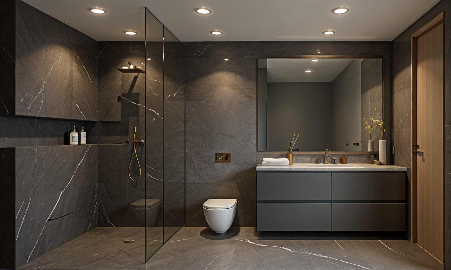 realistic building with black brick and a lively restaurant ambiance on the first floor with chairs and people eating outside lights coming from withing the building