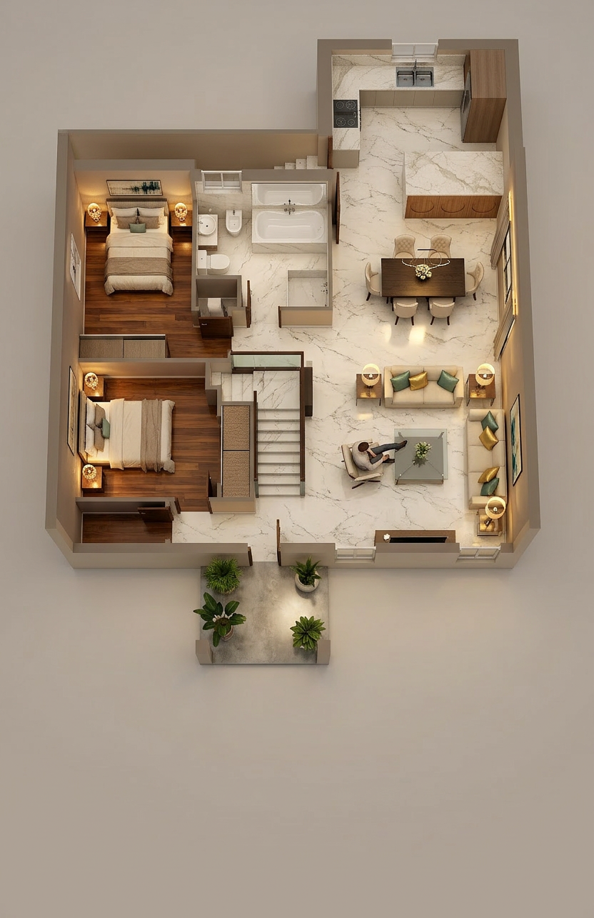 convert this floor plan into a architectural isometric 3d view of a full house show the space from an elevated angle with furniture walls and details visible use the same furniture as shows on the plan do not change the orientation of the floorplan
