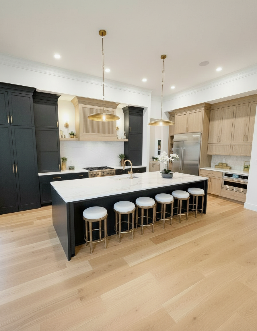 change cabinets to a mixture of white oak and iron ore paint color leave island alone
