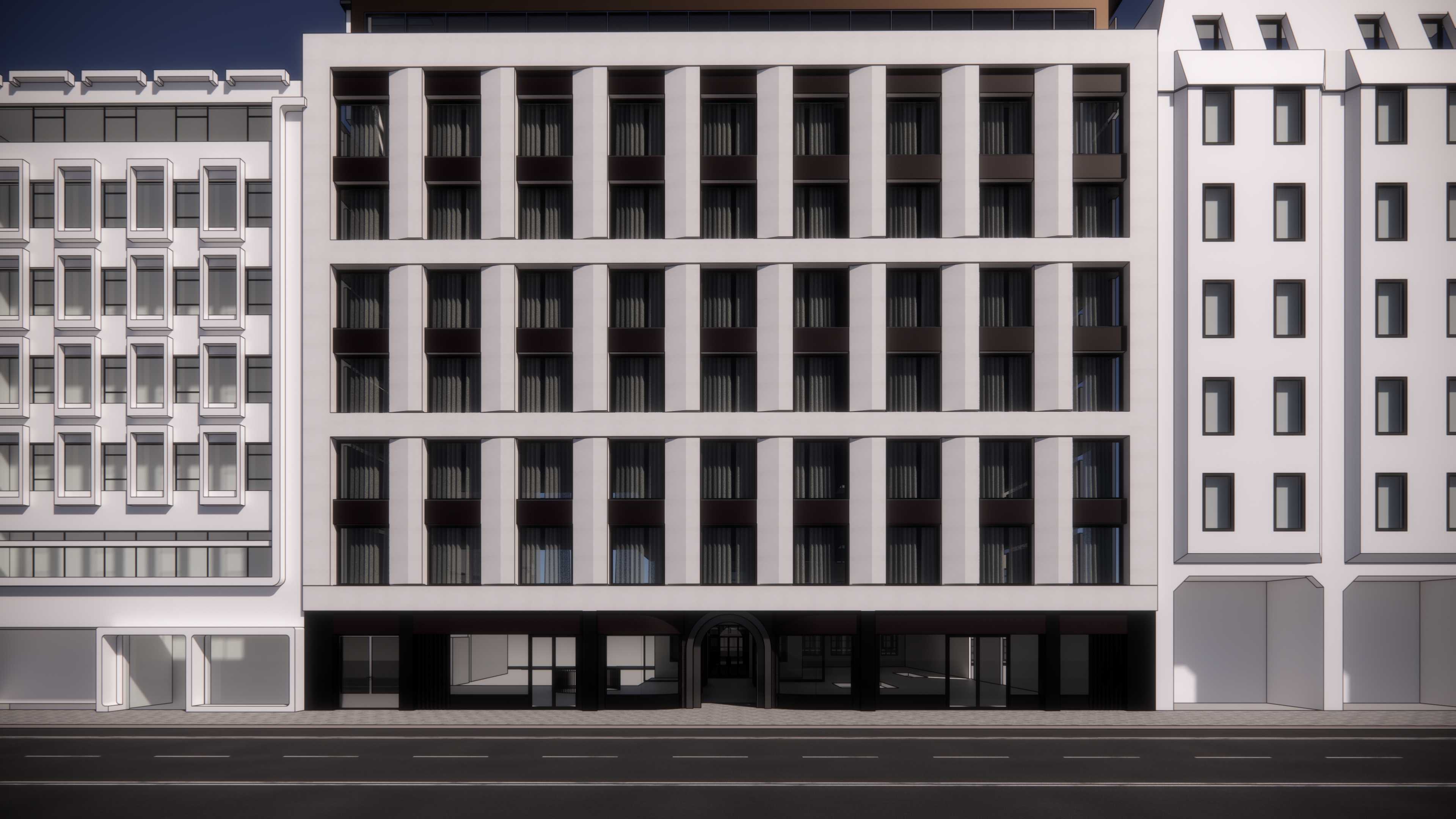 this is a light white stone facade please improve materials and reflections on the ground floor add some people and restaurant on the back keep the ground floor material as a metal black do not cut the image i want to see all the street