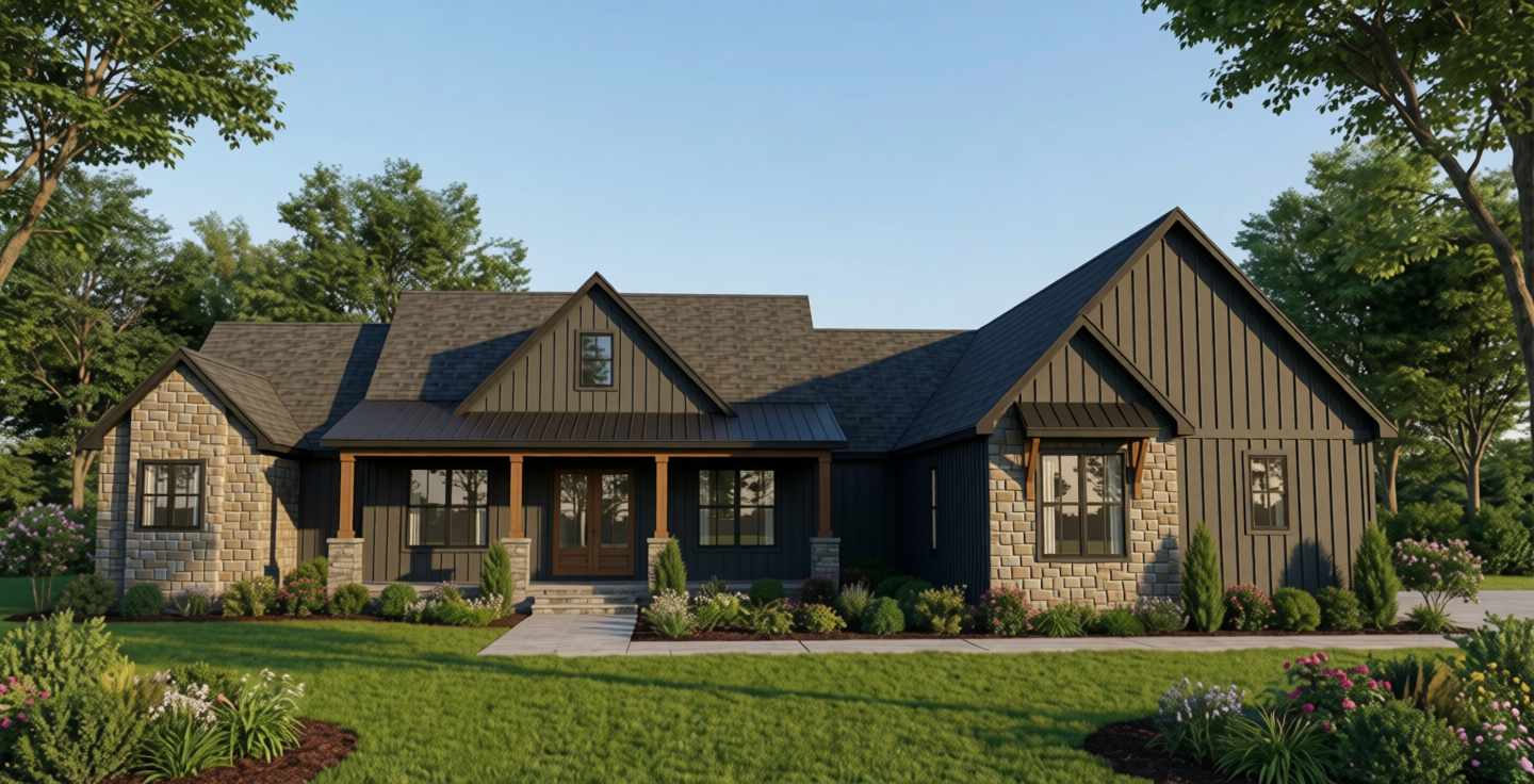 cream color metal vertical siding with a dark green sheet metal roof natural wood color window trim shutters and door no stone or brick trees in the background sunny day with some clouds do not make structural changes