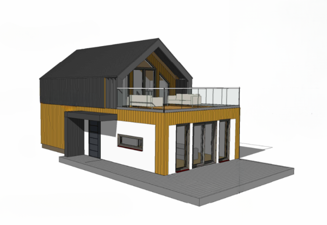modernist exterior shot create a cozy modern wooden cottage with a teak and white plaster facade and sheet metal steel sheet metal on the seam the cottage has large windows and a minimalist design in anthracite color set in a peaceful outdoor environment with clear blue skies lush green grass and a sense of peace soft natural sunlight bathes the scene casting delicate shadows that enhance the inviting atmosphere architecture
