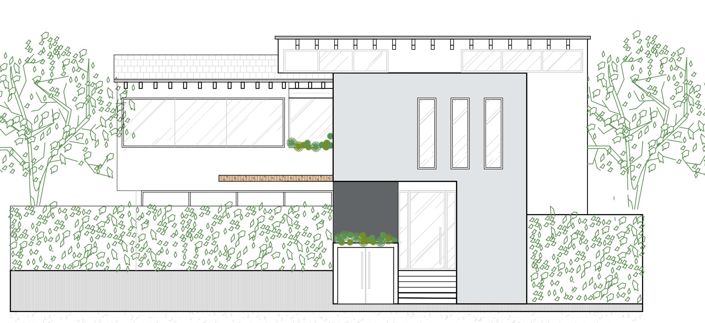 valle de bravo style house contemporary architecture with rustic mexican influence clean and well defined volumetry sloped roofs with traditional orange clay tiles exterior walls finished in smooth white windows with black metal frames and clear glass include clerestory windows at the highest part of the roof arranged in square modules with black frames and transparent glazing main entrance accessed by stairs front door made of rustic wood solid appearance with transparent glass side panels on both sides at the lower level include storage doors made of black metal to the left of the main entrance there s a gray volume enclosed it with a black screen composed of horizontal slats of varying widths creating texture and visual rhythm the access stairs should also be integrated within this same black slatted enclosure language front boundary walls on both the right and left sides should be solid white walls fully covered with lush green climbing vines creating a natural organic contrast with the architecture soft natural lighting warm atmosphere realistic shadows highly detailed materials and textures photorealistic rendering style high resolution architectural perspective