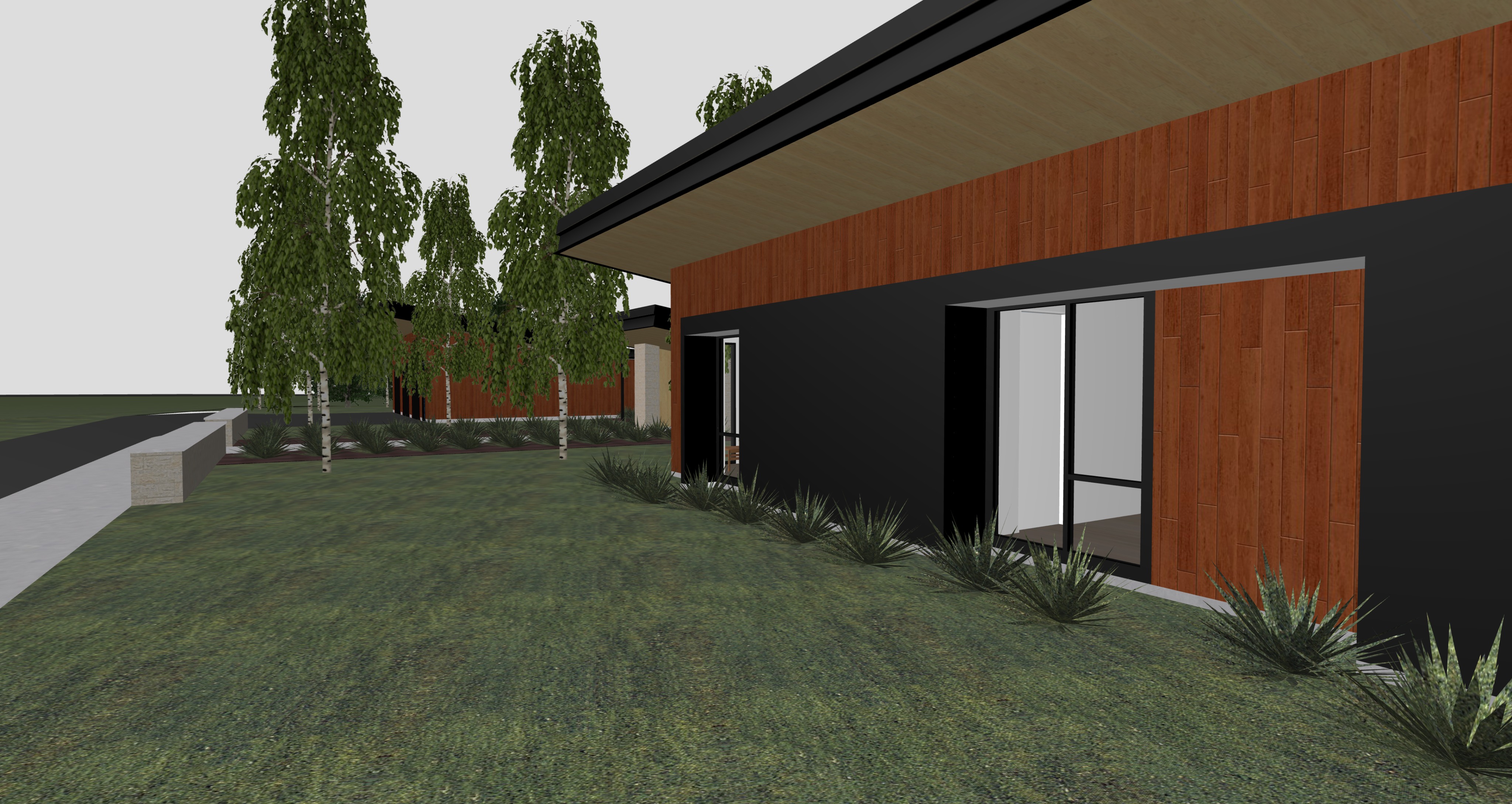 low mountain range in background low plants and shrubs around edge of building fire in fireplace gap refined furniture tan blonde slat ceiling black steel cladding dark brown reddish wood slat siding aspen trees dotting landscape dark green semi wild grass
