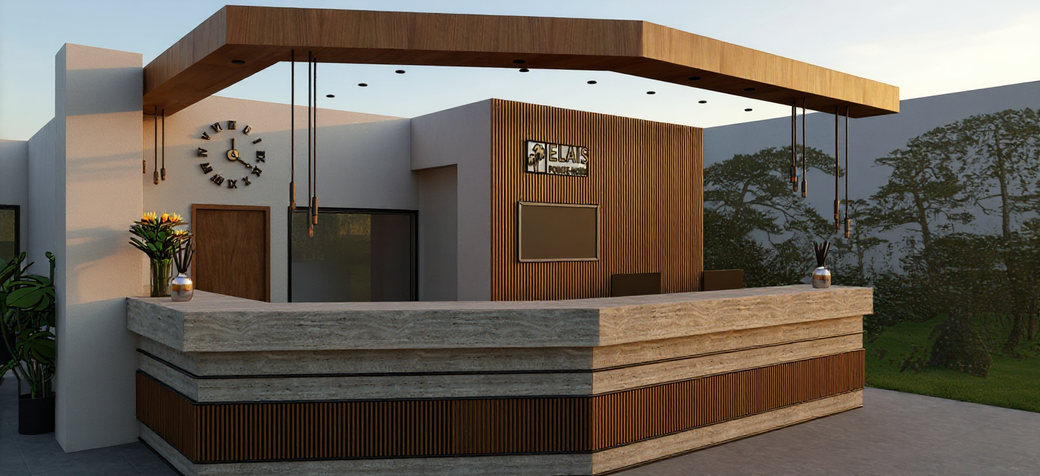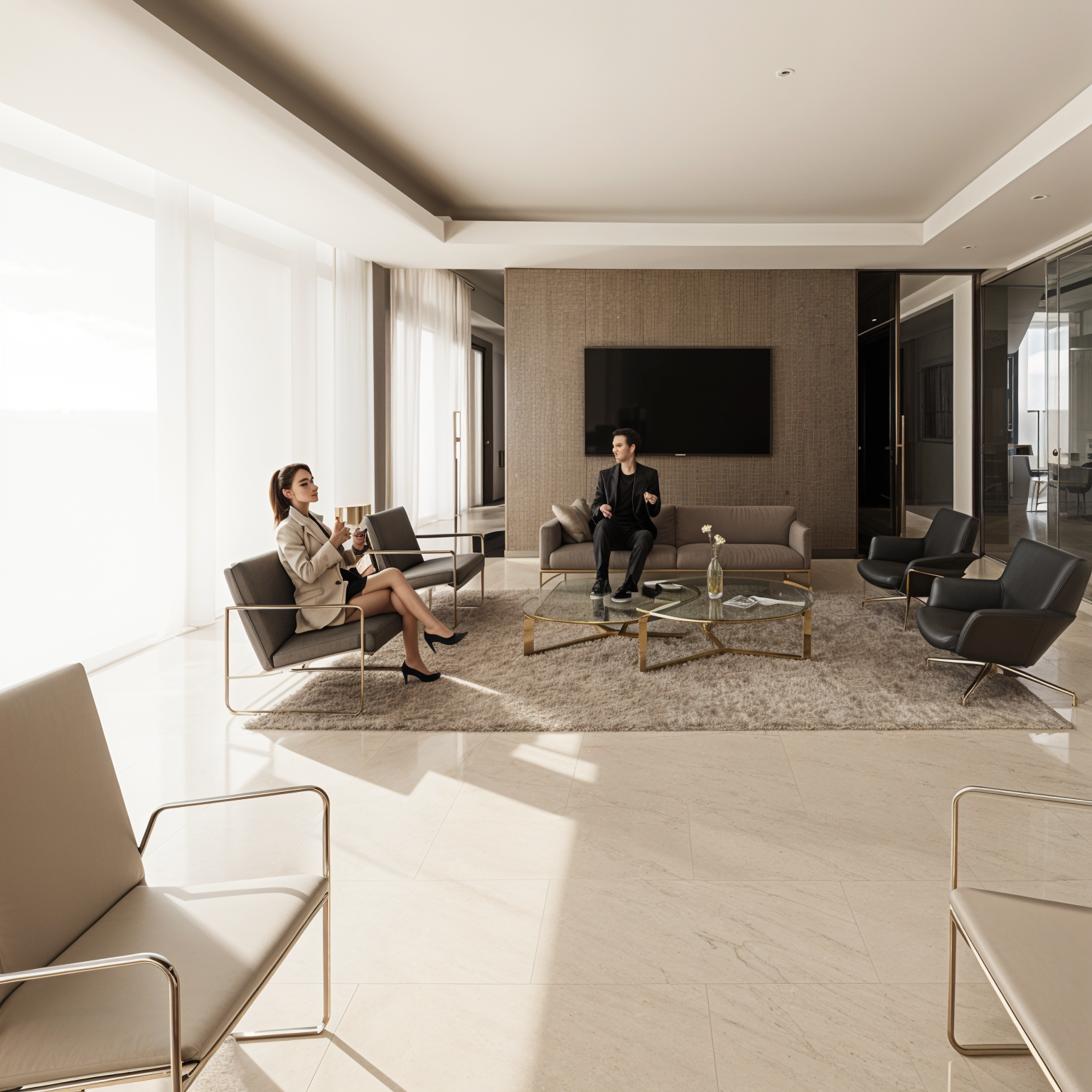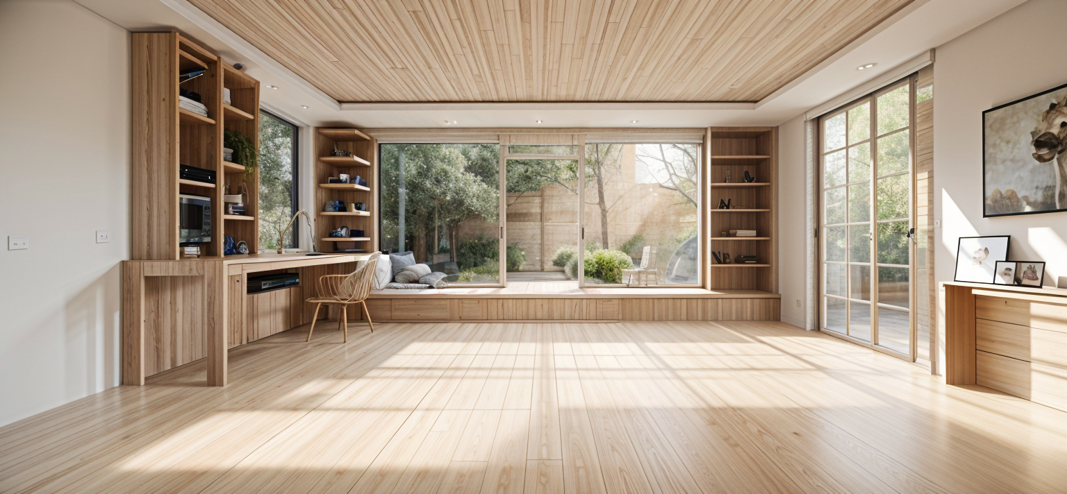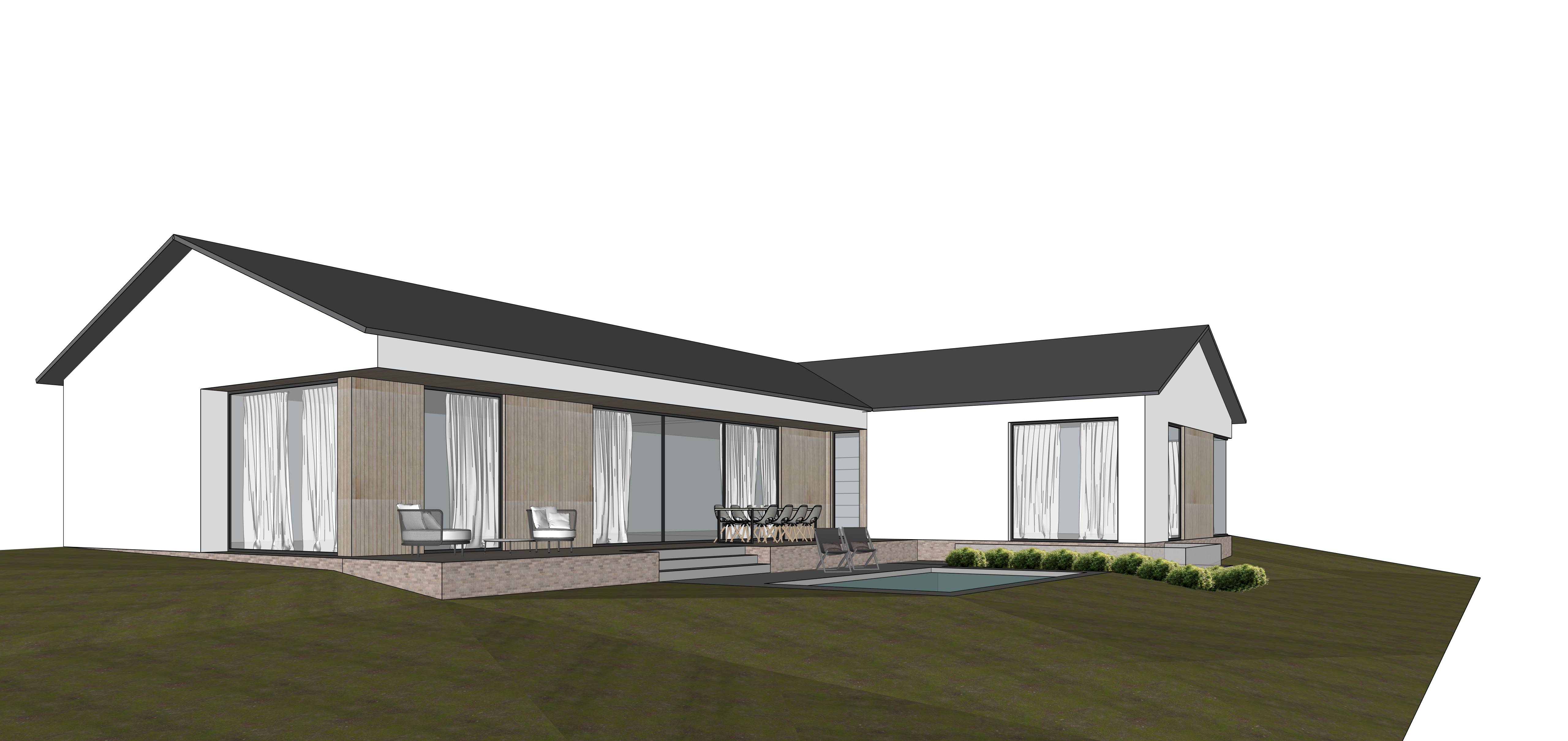 exterior shot a modern l shaped house set on a gently sloping grassy terrain the house features a sleek minimalist design with large glass windows the exterior walls are a pristine white complemented by wooden paneling in a light oak finish the roof is a clean dark slate color contrasting with the white walls the patio area is adorned with contemporary outdoor furniture in neutral tones of gray and beige lush green bushes line the edge of the patio adding a touch of nature to the scene the atmosphere is serene and peaceful with soft daylight casting gentle shadows evoking a sense of tranquility and modern elegance