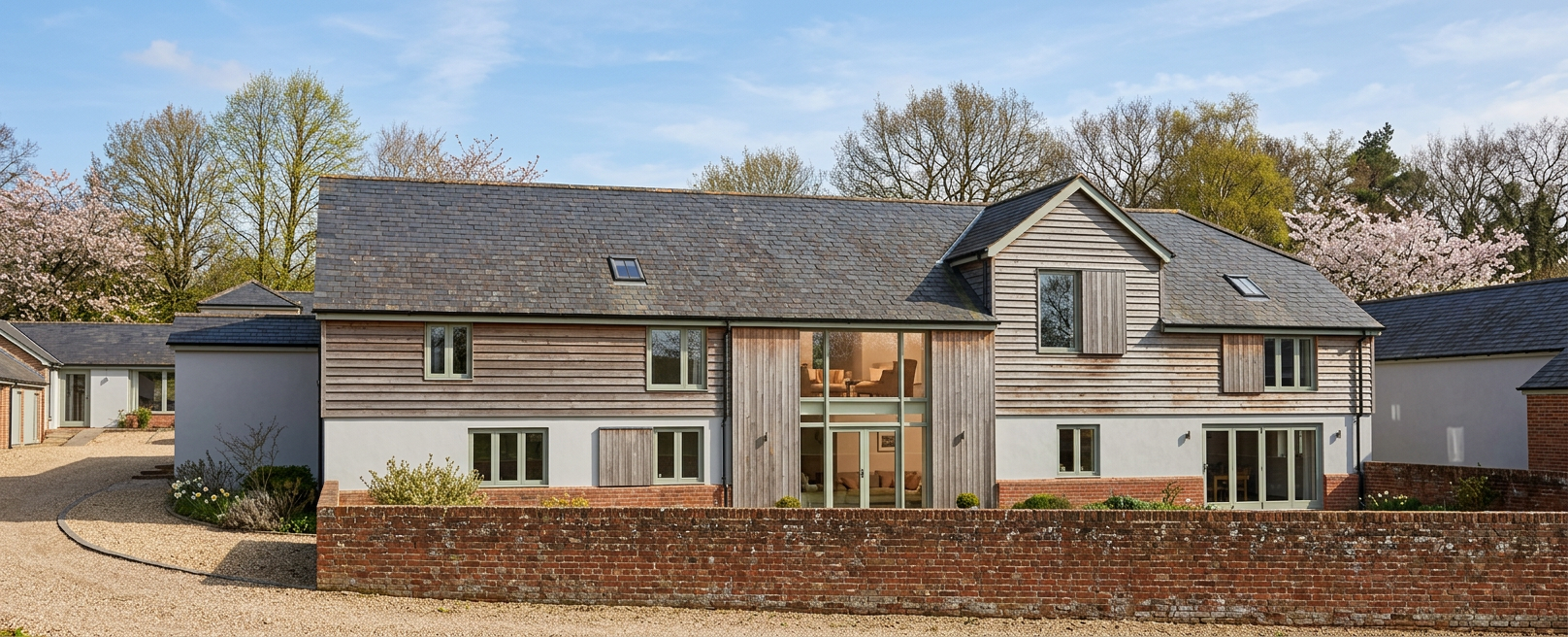 render red brick and wooden clad refurbished barn conversions set on a bright spring day there should be some trees in the background of the image