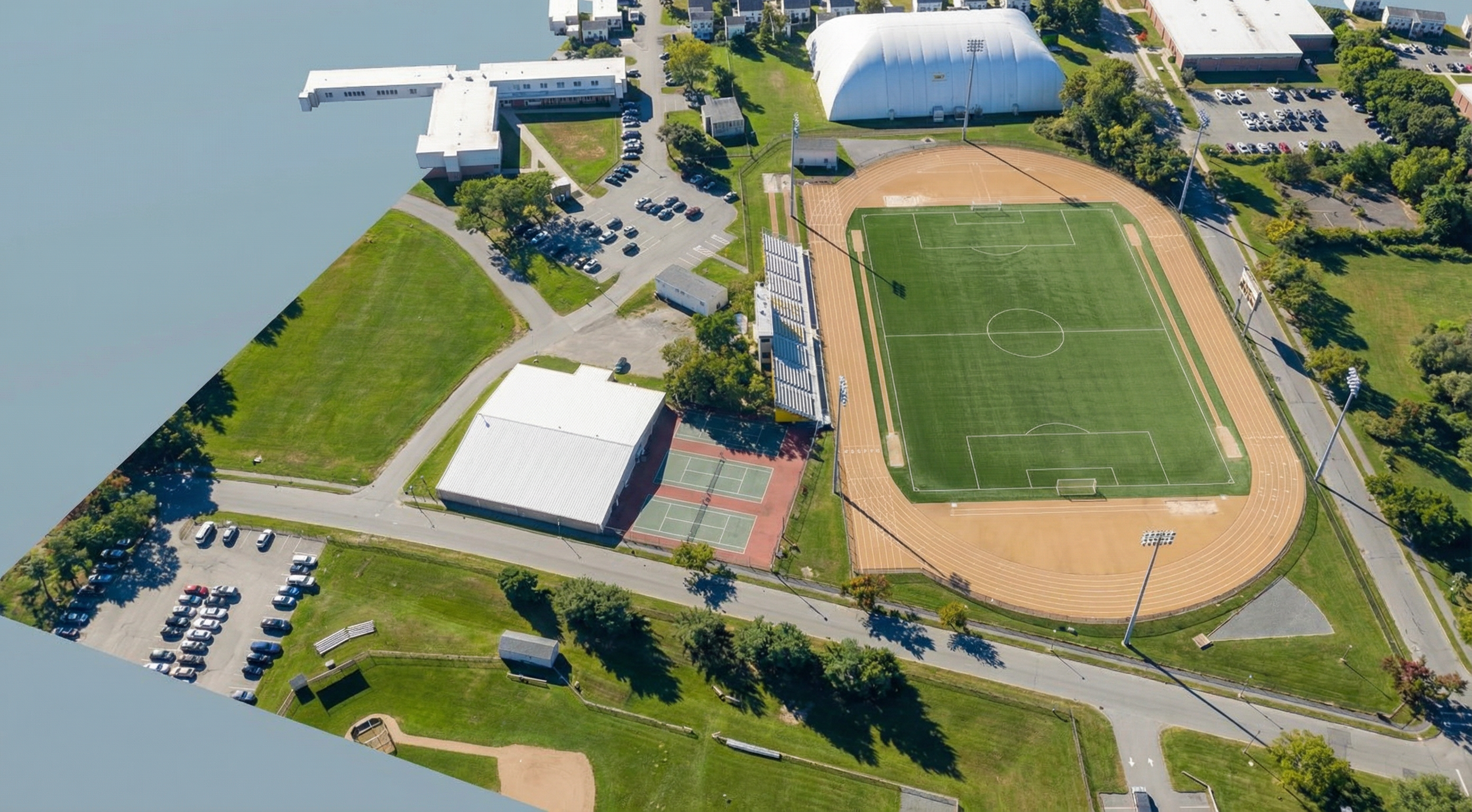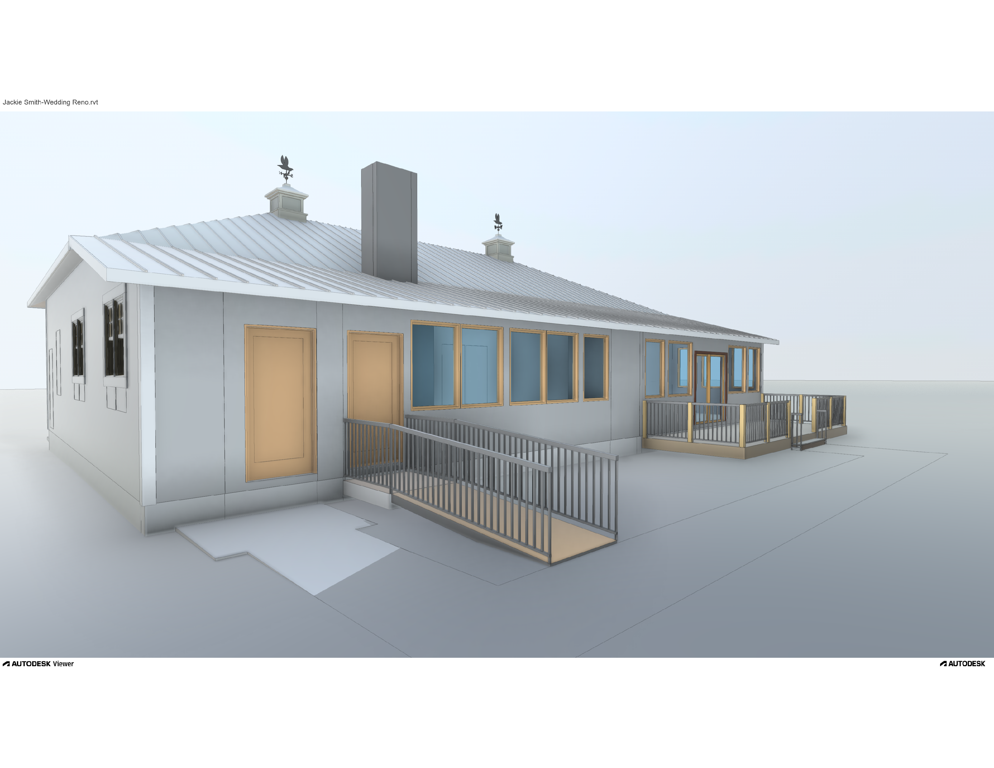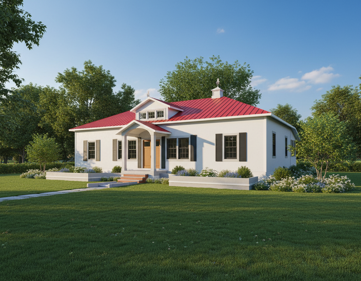 a beautiful modern one story house with a white exterior and white trim the roof is a red metal and the windows are adorned with black frames and black shutters the entrance features a warm oak door the scene is set during a tranquil late afternoon with soft shadows and a clear blue sky the atmosphere is peaceful and inviting capturing the essence of suburban charm with a touch of elegance add trees in the background brick chimney and add steps to door
