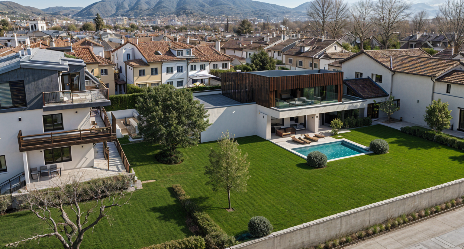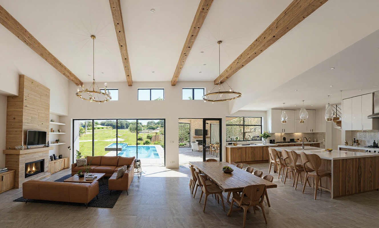 the ceiling features light gray wooden beams and the walls are adorned with subtle white patterned wallpaper the floor is a light brown wood adding warmth to the space position a beige sectional sofa in the center complemented by a gray throw blanket a modern dark wood coffee table is set on a textured light gray rug include a few lush green indoor plants for a touch of nature on one side place a sleek wooden desk with a contemporary black and gold desk lamp and an open laptop accent the walls with a set of black and white framed photographs providing a minimalist aesthetic add large geometric black pendant lights hanging from the ceiling creating a focal point the atmosphere should feel cozy and inviting perfect for relaxation and creativity brighten up the scene a little bit