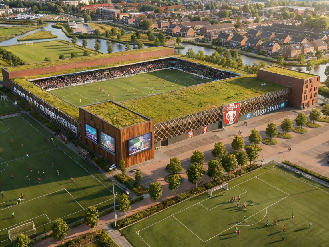 add two large video screens on the wooden front facade directly left and right of the fc dordrecht billboard keep the rest of the picture exactly the same