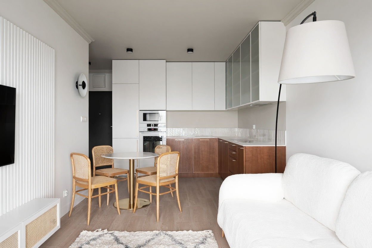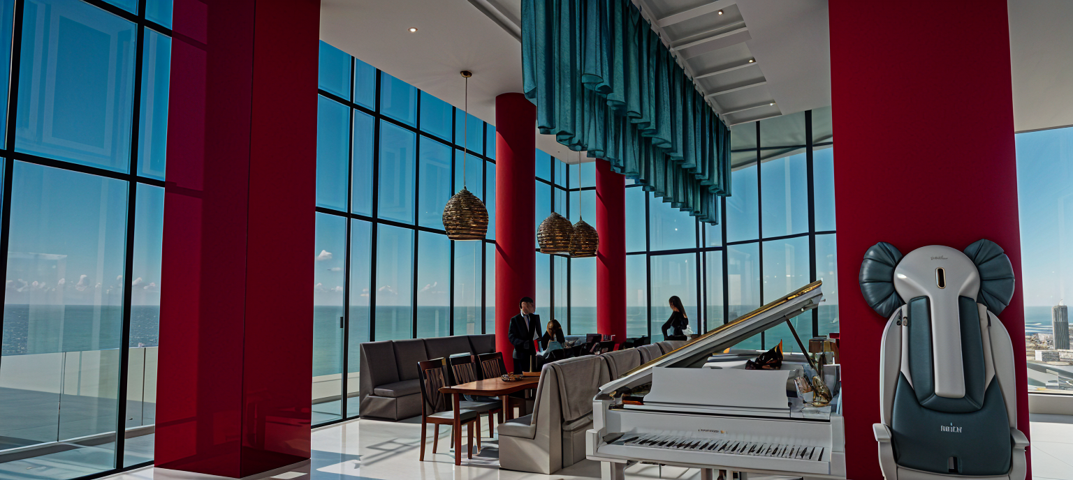 exterior shot transitional one story single family house with dark metal roof and tall windows white crisp painted walls black frame window blue sky