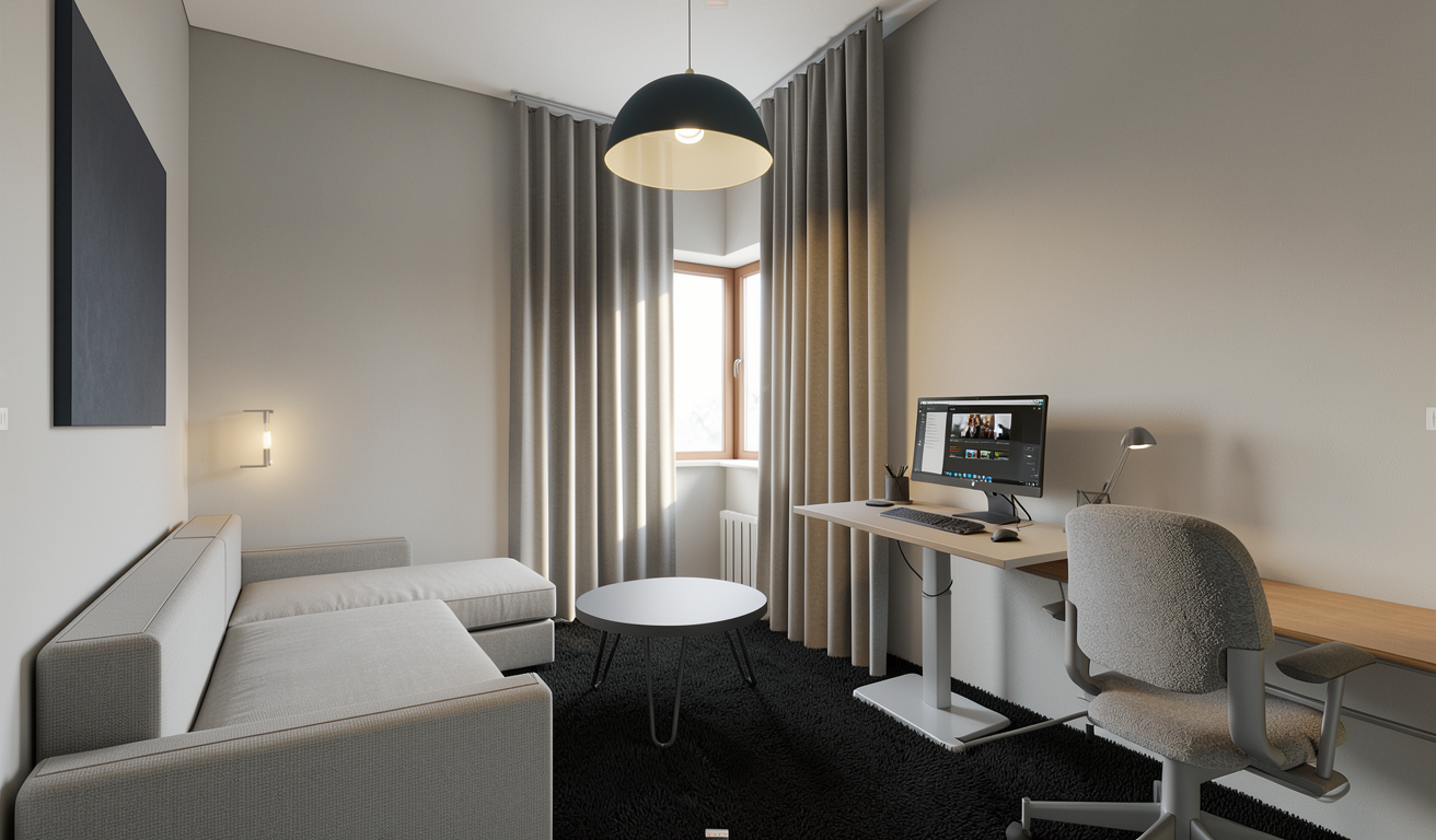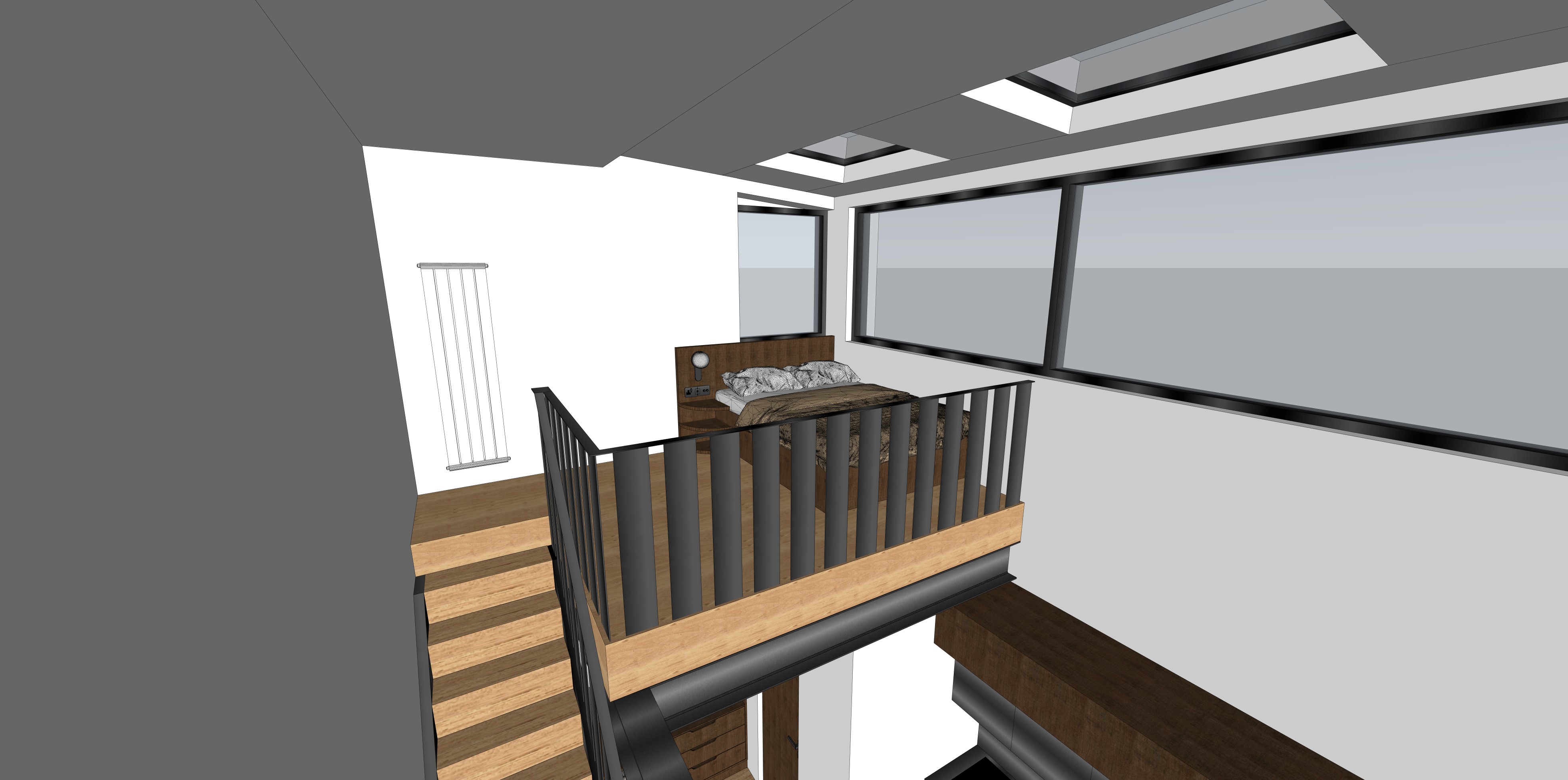 this is a photorealistic render of a mezzanine studio room the bed frame is made of a dark walnut veneer the balustrade is blackened steel the beams are black and have led strips integrated into them the flooring is a light beech wood the wall is a subtly textured white plaster the skylights and windows have neutral blinds on them the overall ambience is warm and homely with sunlight coming through the roller blinds it is dark but mostly lit by the led strips the ceiling is also a white subtly texture plaster the overall tone is warm and inviting