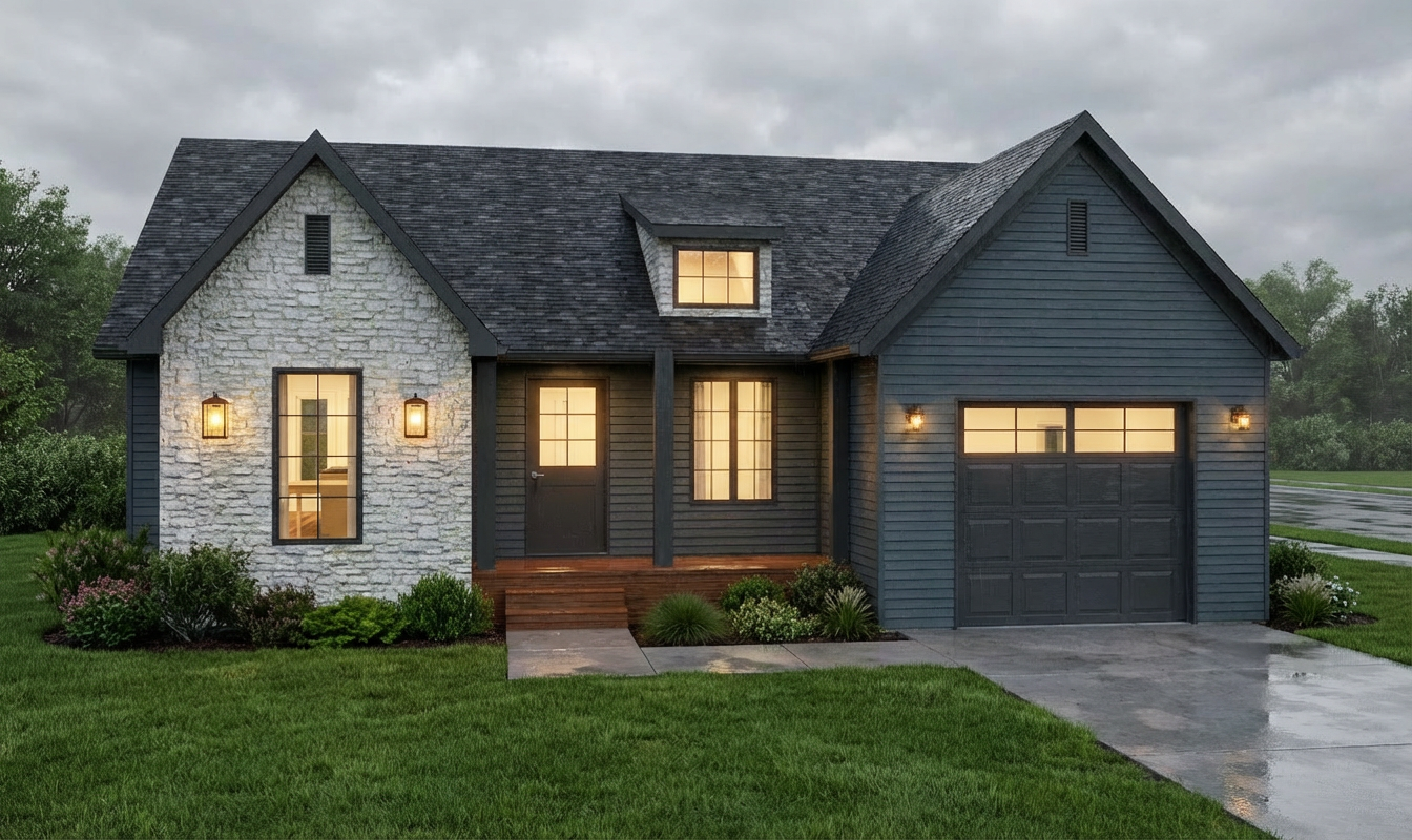 professional southern landscaping lake is behind the house scenery light blue siding light brown brick white windows white trim white gutters white fascia white porch post brown stained doors on the front