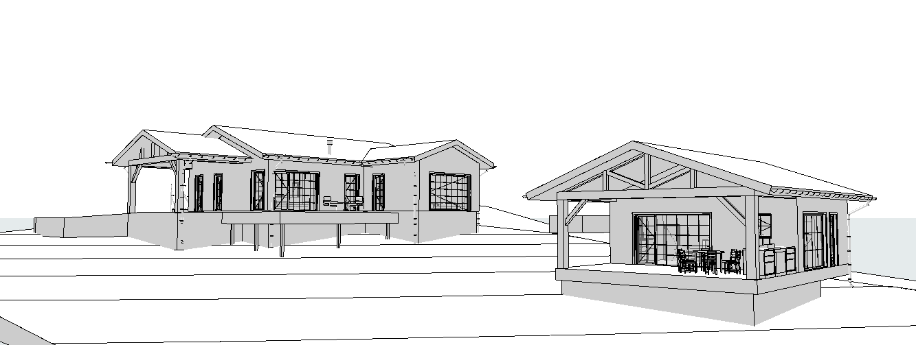 neoclassical exterior shot create a photorealistic 3d perspective of houses and baths on a small slope of lawn use the following materials on the facade of the building wood and brick as on the mudboard use metal tiles of anthracite gray colors on the roof fully preserve the geometry of the model windows doors walls slopes create lush vegetation around the house and bathhouse from cereal and flower arrangements don t change the volume just make the landscape more attractive detail the textures of wood and brick on the facade of the building and work out the terraces on the house and bathhouse let them be in wood and also make a bright clear sky with a light atmospheric depth as well as add a light fog add trees in the background create hyper realistic architectural visualization in 4k resolution architecture