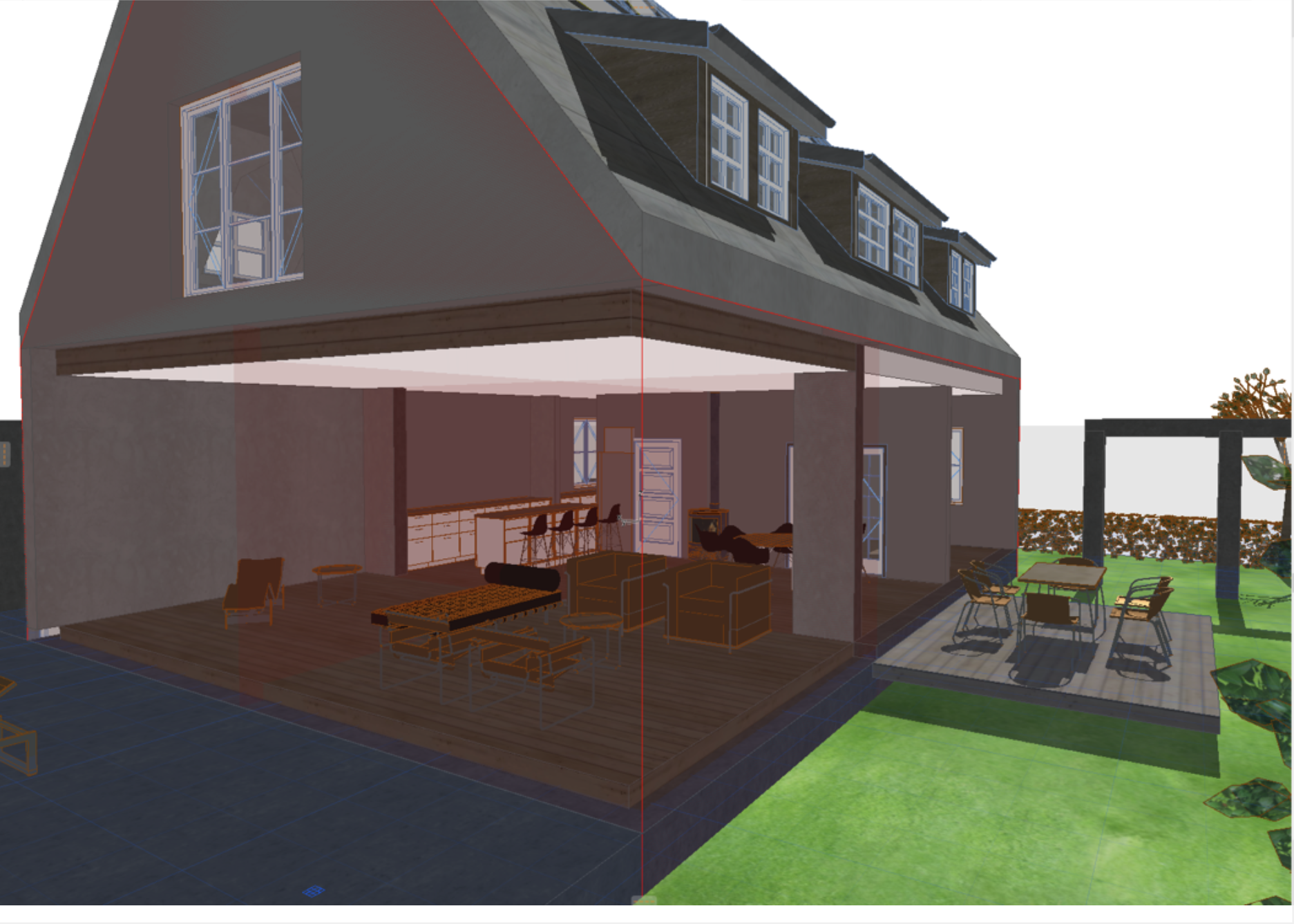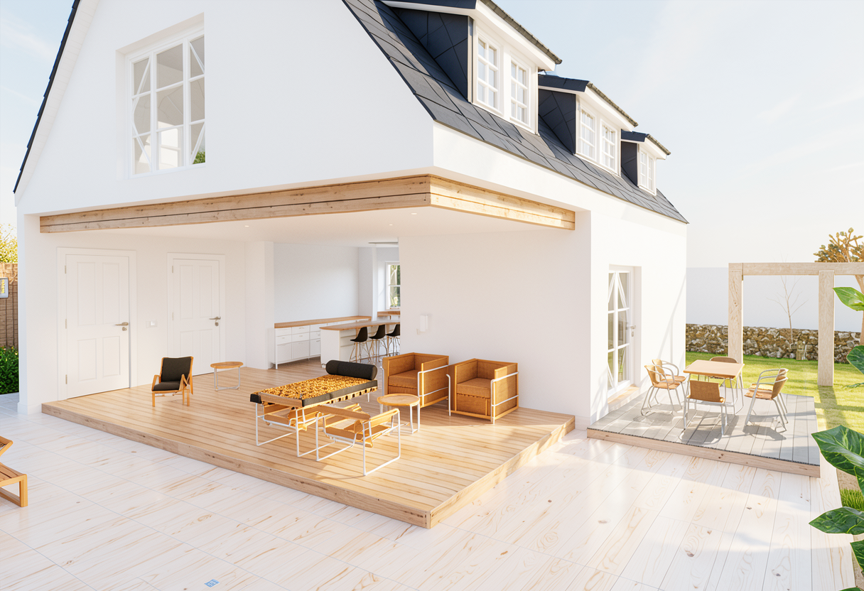show white walls and white windows and white doors and fishbone wood white oak floor green area lush grass and deck concrete