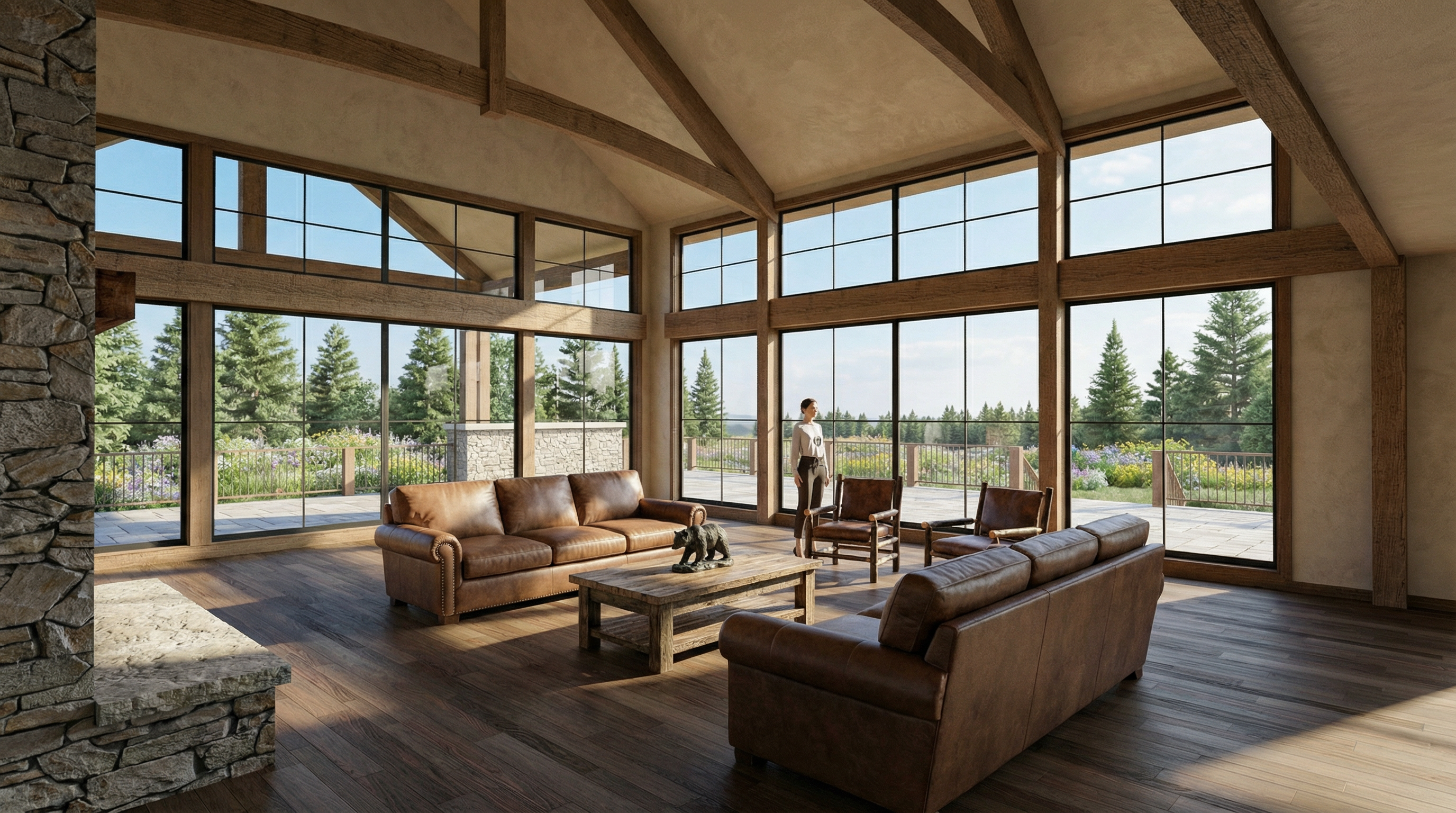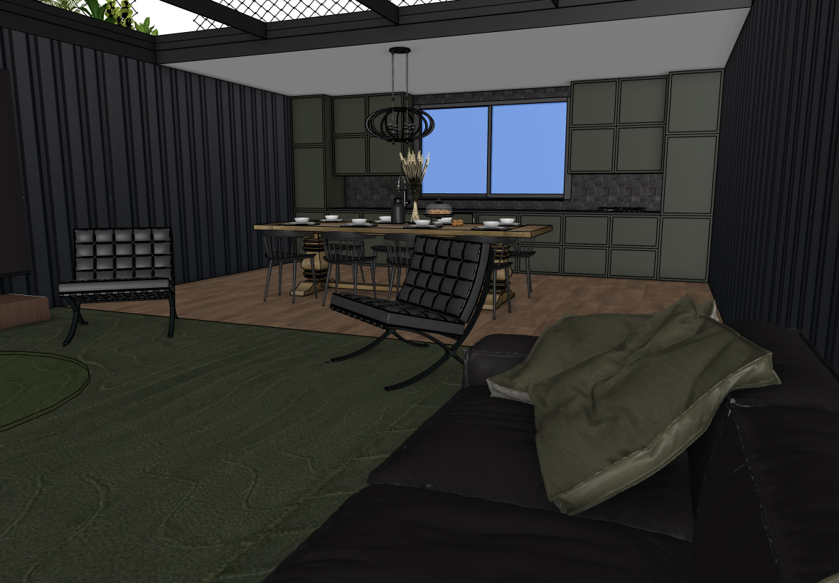 the couch is black leather the rug is green and has a nice texture the walls on both side are container and the kitchen is olive cold green