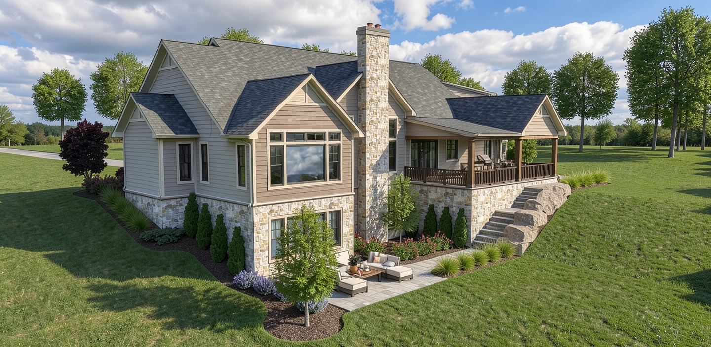 partly cloudy sky some deciduous trees in background add gutters