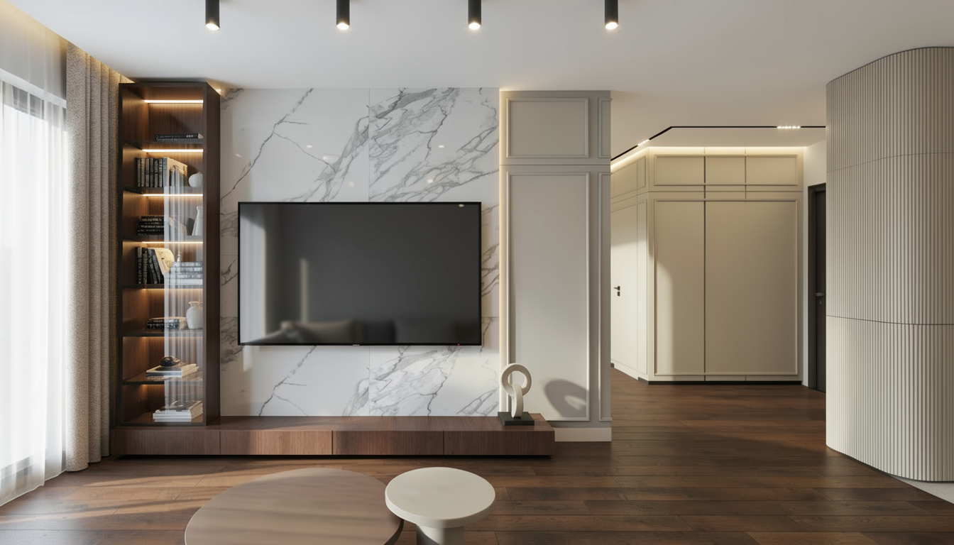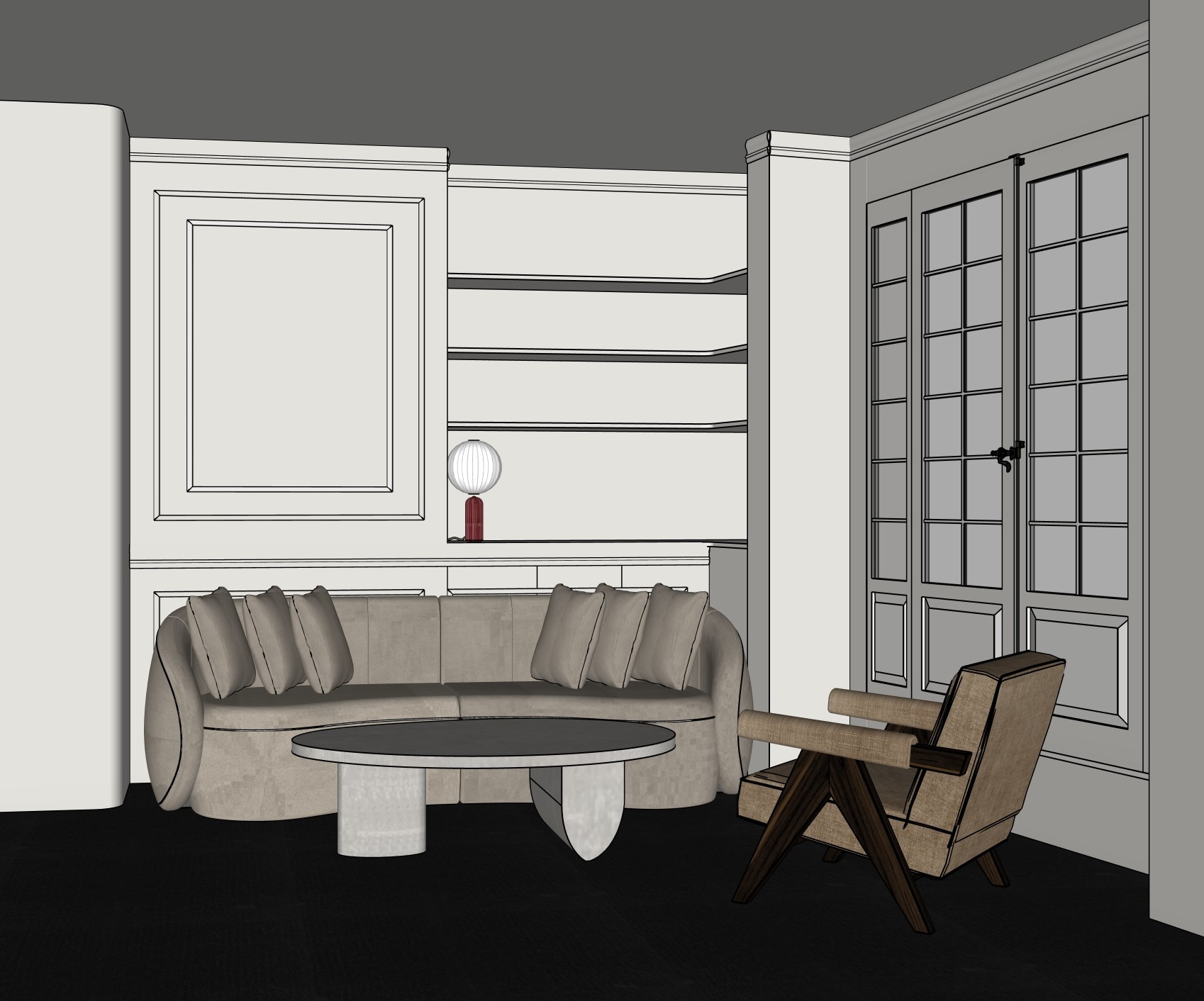 the appartment is on the 6th floor in a parisian building the walls are in very light greige the floor is in black wood the sofa is in moody terracotta velvet the ceiling is in the same color as the walls the espagnolette bolt is in dark bronze add some ancient books on the shelves the tabvle is in travertine the frame of the window is the same color as the walls
