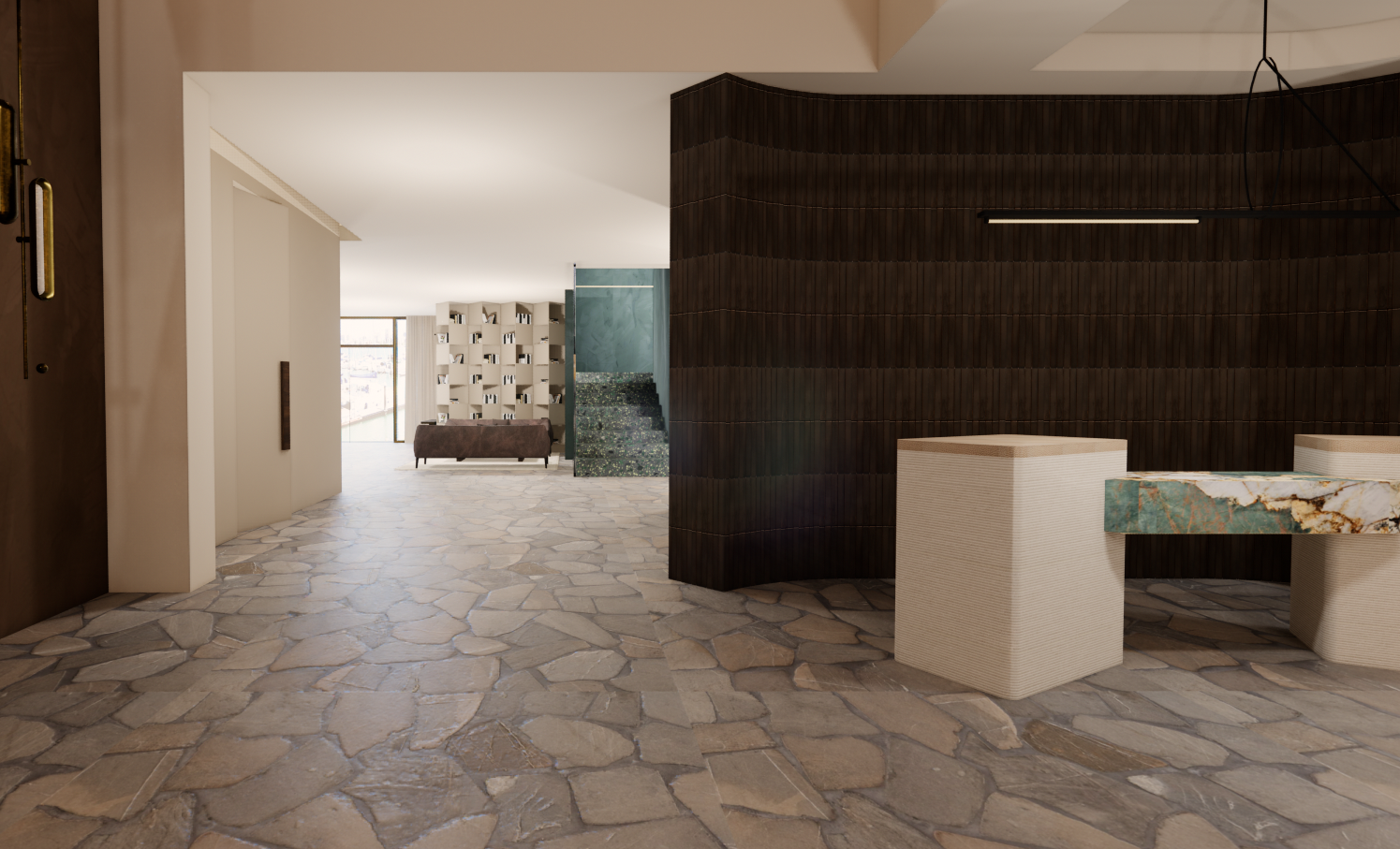 transform the provided hotel lobby interior image into a high end photorealistic render with warm golden hour atmosphere soft glowing highlights and relaxed upscale modern and dynamic energy while keeping everything exactly the same same proportions same colors and same materials and same spatial configuration do not move or alter any objects geometry textures colors furniture positions throughout the interior must remain exactly in the same locations and proportions their materials should read realistically no additional furniture add premium decor objects including wine glasses luggages and phones on tables include modern young guests casually social correctly scaled tastefully integrated without crowding or obstructing architectural details shelving should feature warm and bright accent lighting enhancing reflections lighting should emphasize golden hour warmth gentle reflections soft shadows enhanced color richness and luxurious catalog level realism improve depth and realism through wood grain richness marble shine brass highlights fabric texture and polished clarity while keeping the entire scene exactly as originally designed