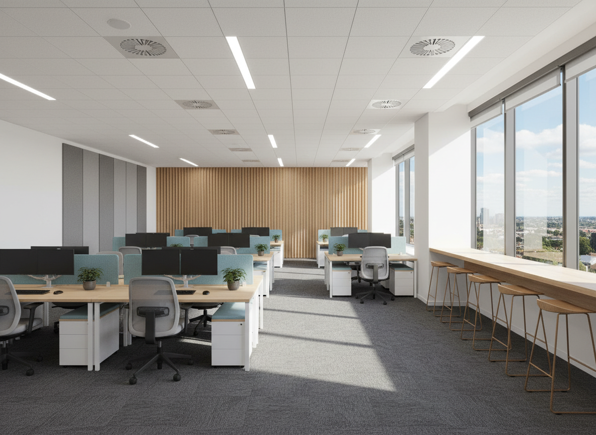 ultra realistic wide angle interior photo of a modern kitchen matching clay render layout stove burners in the foreground countertop in the midground cabinetry in the background bright daylight from left windows casts soft shadows material tones from reference photo with muted sage cabinetry stainless steel appliances open wooden shelves filled with ceramics and greenery white subway tile backsplash interior photograph of a modern ikigai inspired kitchen background editorial lifestyle photography calm and inviting tone