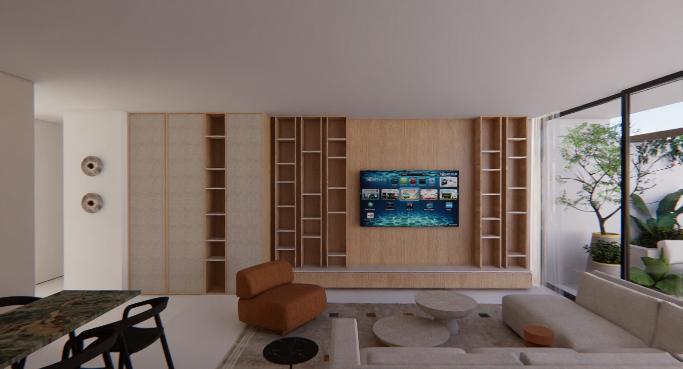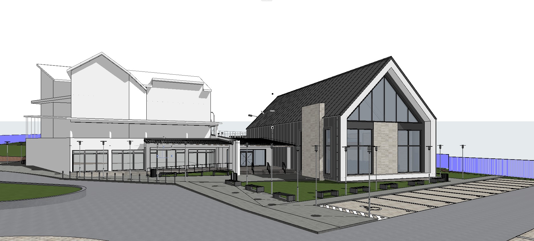 modern architectural building with clean geometric lines featuring a tall triangular roof design render in a realistic style with bright daylight use soft white and light grey for the building exterior with dark grey window frames accentuate the large glass windows with reflections of a clear blue sky add lush green grass in the garden areas and a smooth light grey concrete path the parking area should have defined spaces in a darker shade of grey with white lines incorporate soft shadowing for a calm atmosphere chnage background to small forest put some cars to parking and put reaslisti wall and plants