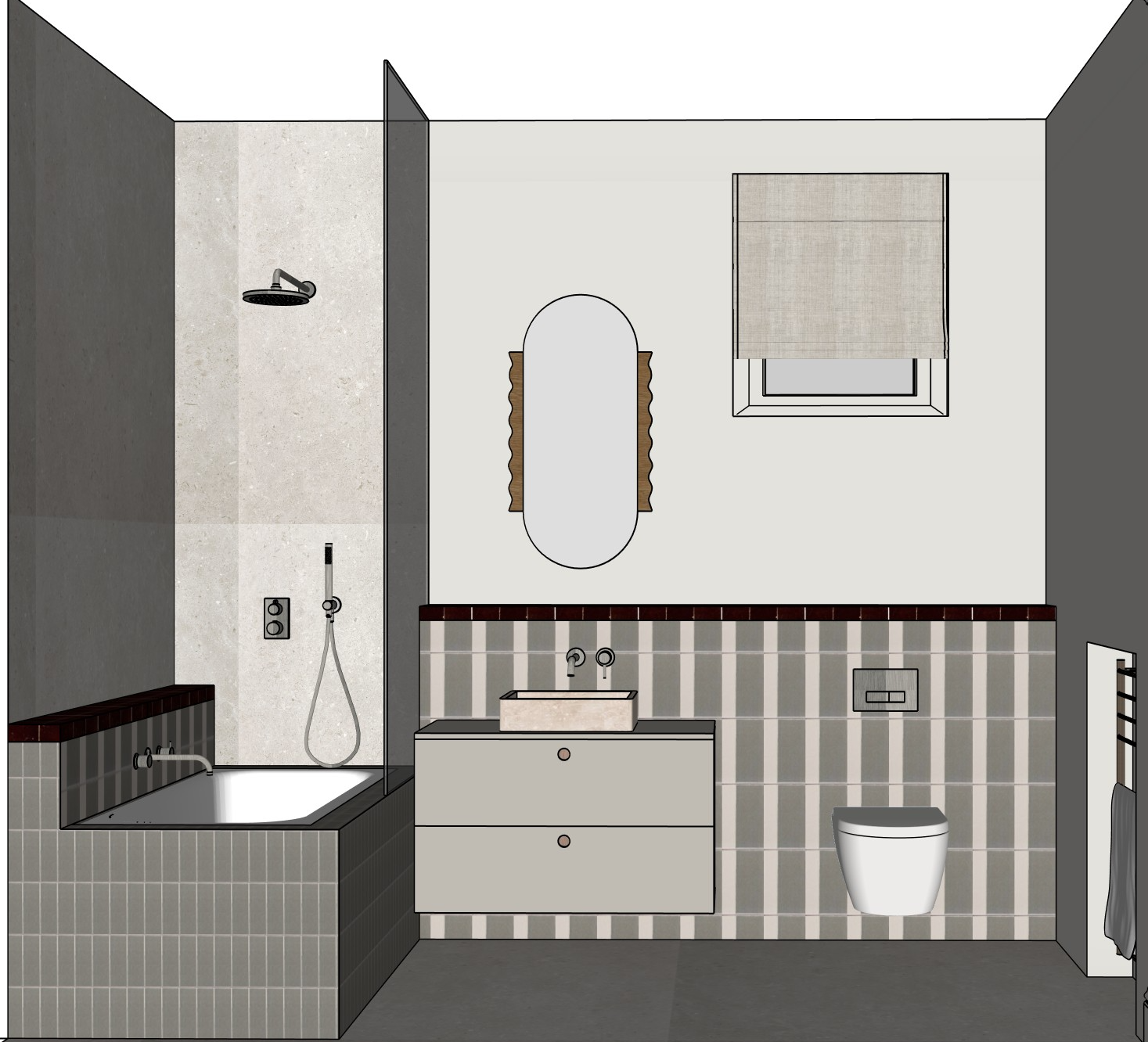 the light sage green tiles are these https collectionsdarchitectes fr products rebels variant 55436883657048 the dark burgundy tiles are these ones https www leroymerlin fr produits zellige marocain 5x5 cm carrelage mur terre de zellige vendu a plaque 30 x 30 cm prix indique a plaque marron fonce 07 92850626 html megaboost at medium sea paid at campaign pd 06 soletcarrelagemural pmax shp pla top 3p at source google at market m4 at section r6 at campaign id 20490834400 at campaign type pmax at account leroymerlin marcheprojetdeco at account id f149fwwg gclsrc aw ds gad source 1 gad campaignid 20486532698 gbraid 0aaaaadgndyu24fsizrql17ggtgvmkjt4d gclid cjwkcajwhqfpbhbweiwazo196qsg0arjg6zdn4obhk3vyetlz8iin9raesarttkucqf0reu0cphzrxocgy0qavd bwe the walls around the bathtub are in living ceramics beren light grey the floor in front of the vanity is in living ceramics beren light grey the vanity is in farrow and ball purbeck stone https www farrow ball com fr peinture purbeck stone the sink is in travertine the wall behing the mirror is in light greige a plain wall should be visible in the mirror