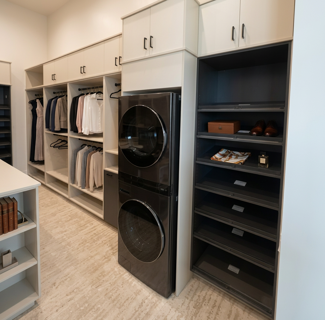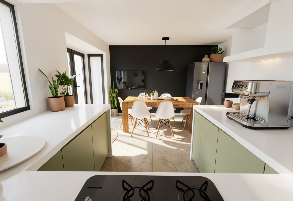 modern kitchen interior sleek design soft natural lighting warm and cozy atmosphere white walls and wall cabinets smooth white countertops with muted matt khaki green base cabinets the far back wall is dark charcoal grey and has a tv and dark grey stainless steel fridge freezer a wooden dining table in a light oak finish and gloss white top white eames style chairs with wooden legs casting soft shadows on a stone floor in a matt muted beige tile a matte black pendant light above the table for an industrial touch minimalist decor with a few pots in muted earthy tones and a vibrant green snake plant for a touch of freshness stainless steel espresso machine with a brushed finish on the countertop reflecting subtle light large windows with black frames creating a contrast and allowing daylight to illuminate the space