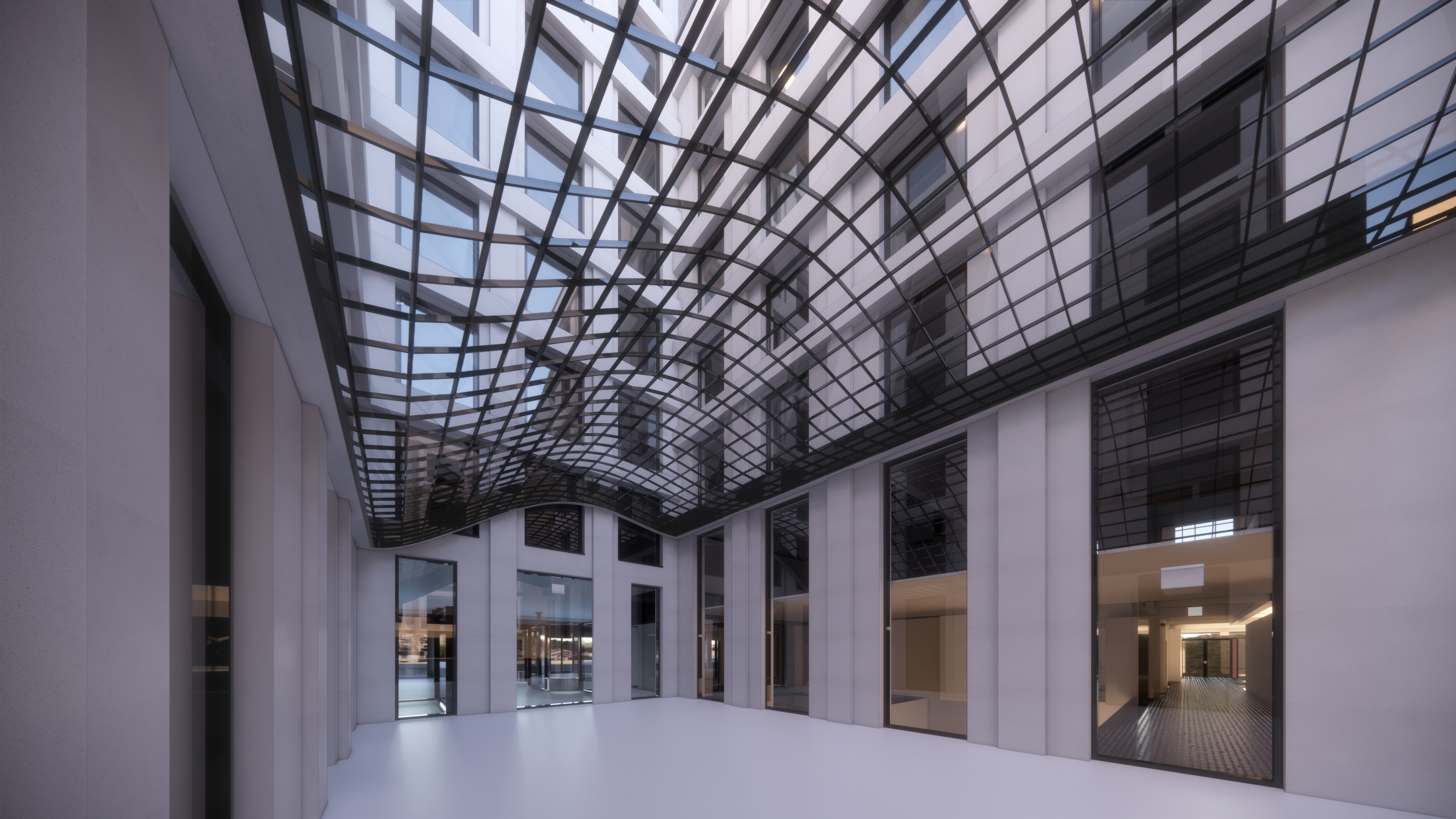 improve reflection and light in this courtyard add people and a small water sculpture on the right there is an hotel entrance