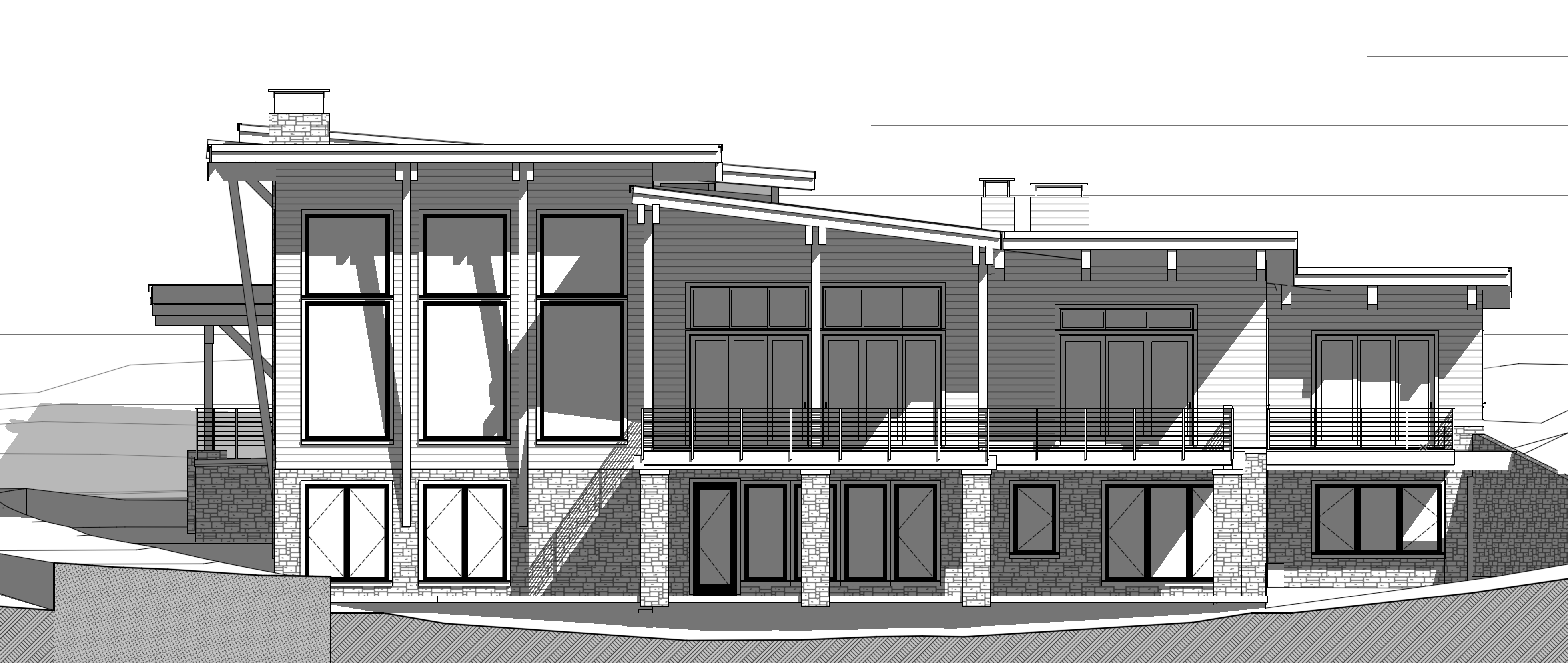 rendered elevation dark wood siding dark stained timbers stacked stone base snowy winter scene with forest in the background