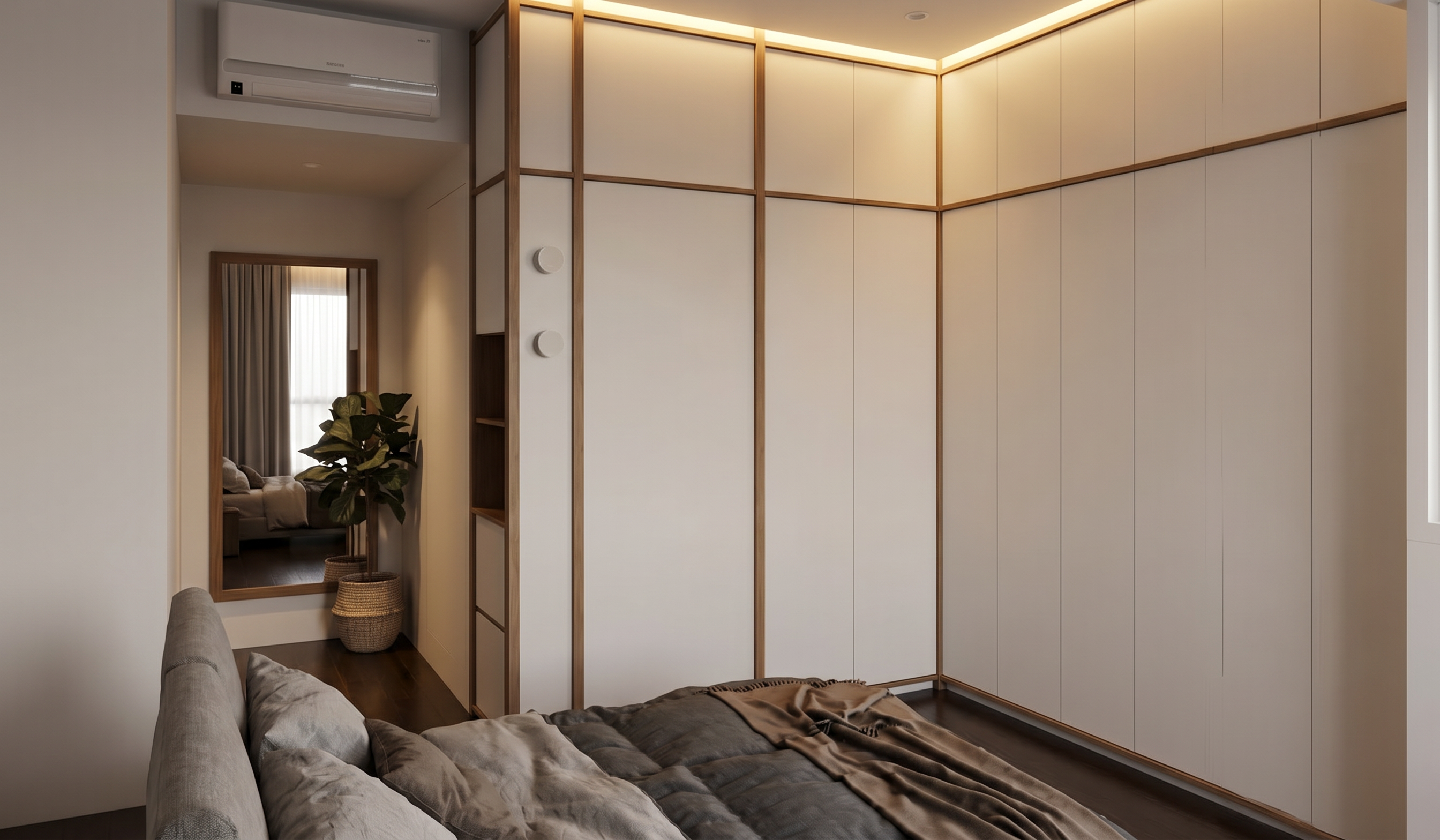convert this floor plan into a realistic isometric 3d view of a full house show the space from an elevated angle with furniture walls and details visible minimalist decor scandinavian style flooring wood sofa beige use the same furniture as shows on the plan do not change the orientation of the floorplan