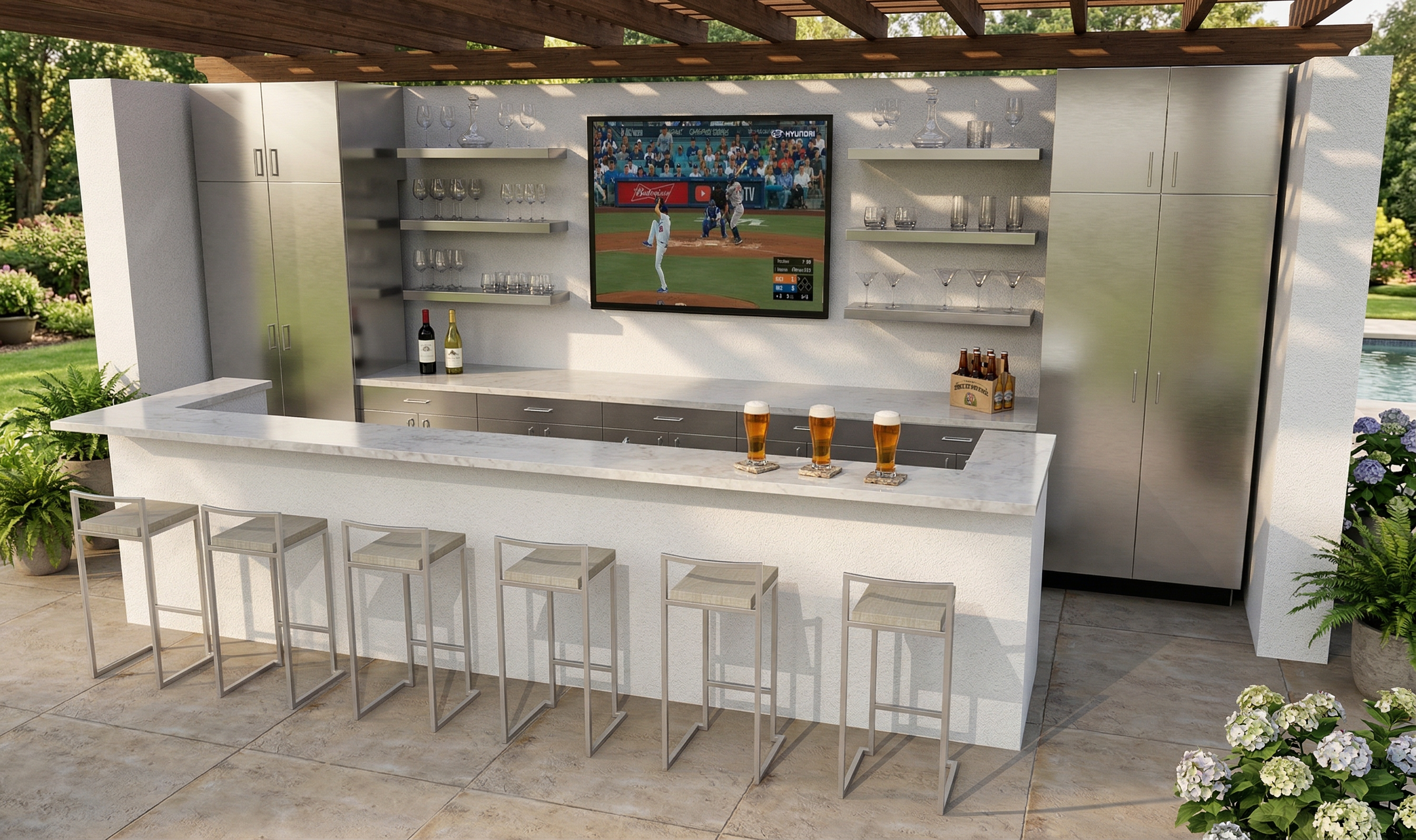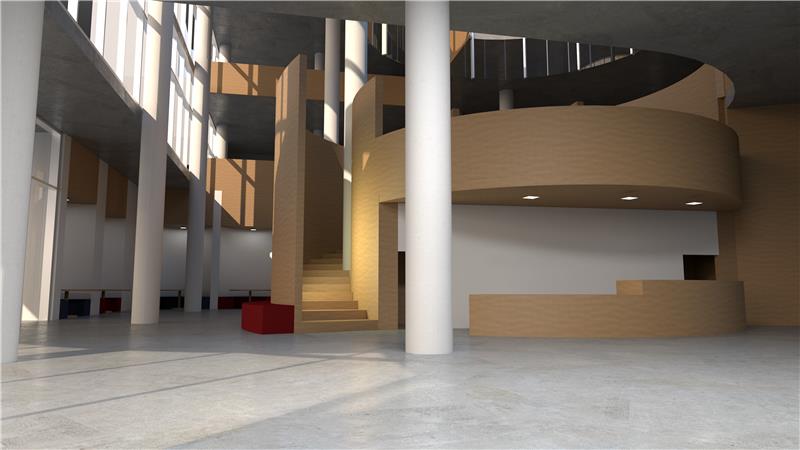 contemporary interior shot use the generated image as the base the scene is the entrance agora of a contemporary library it includes a reception desk a wooden staircase leading to the upper level a large seating area on the left with round tables and built in banquettes integrated into semi cylindrical niches at the back materials are white gypsum walls exposed concrete floor columns and ceiling and natural wood elements the fa ade is a curtain wall bringing strong natural daylight into the space the design is finalized and must remain unchanged strict instructions preserve 100 of the existing architecture geometry materials camera angle and composition do not redesign or modify any architectural elements apply only the following modifications reception desk add a computer setup on the desk add one person working at the reception keep it minimal clean and realistic seating area add multiple circular tables on the left side ensure a natural and organized layout respect and reinforce the circular design concept human presence add a few people 3 to 5 maximum natural activities sitting walking interacting waiting correct scale and perspective subtle integration lighting enhance natural daylight coming from the curtain wall bright soft and evenly distributed light slightly warm tone to complement wood materials rendering quality produce a highly realistic and professional architectural visualization clean sharp image with balanced contrast accurate material representation concrete wood glass gypsum soft shadows and natural light behavior no artistic filters or stylization important constraints do not modify the reception desk design only add elements on it do not change the staircase do not alter the banquettes in the semi cylindrical niches do not change materials do not modify layout or circulation do not overcrowd the space final priority preserve the original design exactly all additions must be minimal realistic and non destructive style photorealistic architectural render professional quality bright natural daylight clean and welcoming atmosphere architecture