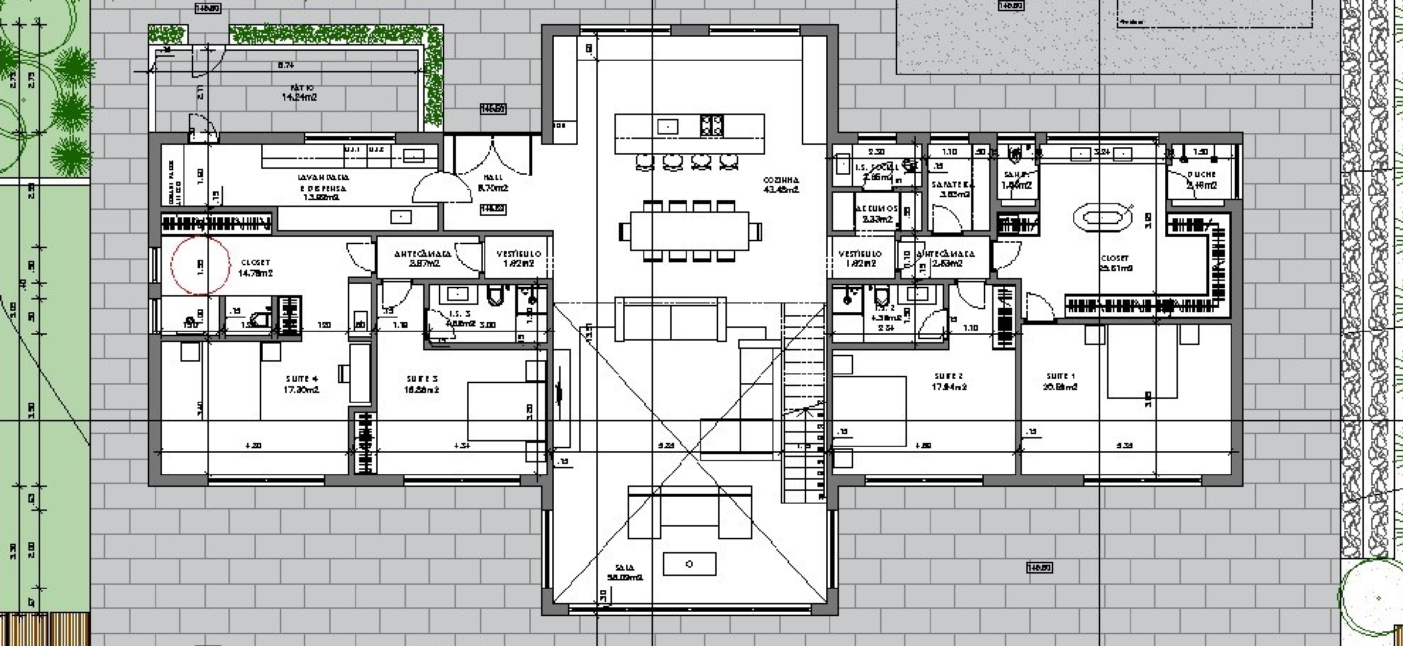 a tua como um arquiteto on muitos anos de experi ncia est planta de uma moradia com quatro quartos 2 em cada lateral todos eles com casas de banho completas sendo a suite a do lado e direito encostada extremidade que nas traseiras do quarto tem um closet comuna banheira charada para a janela com 2 lavat rios contempor neos com espelhos pendurados no teto com uma janela grande atr s do lado direito do lavat rio tem um duche em cabine e do outro lado uma sanita em cabine o v o central uma cozinha e sala de jantar no fundo com p direito de 2 60 com 50m2 e a outra metade sala de jantar com esacadas para a mezzanine que tem duplo p direito paredes em estuque veneziano creme claro e teto forrado a medeiros com vigas de ferro preta igual guarda da escada para acesso ao mezzaninne nos quartos do lado esquerdo atr s deles tem uma lavandaria e arruma o viradas para as traseiras