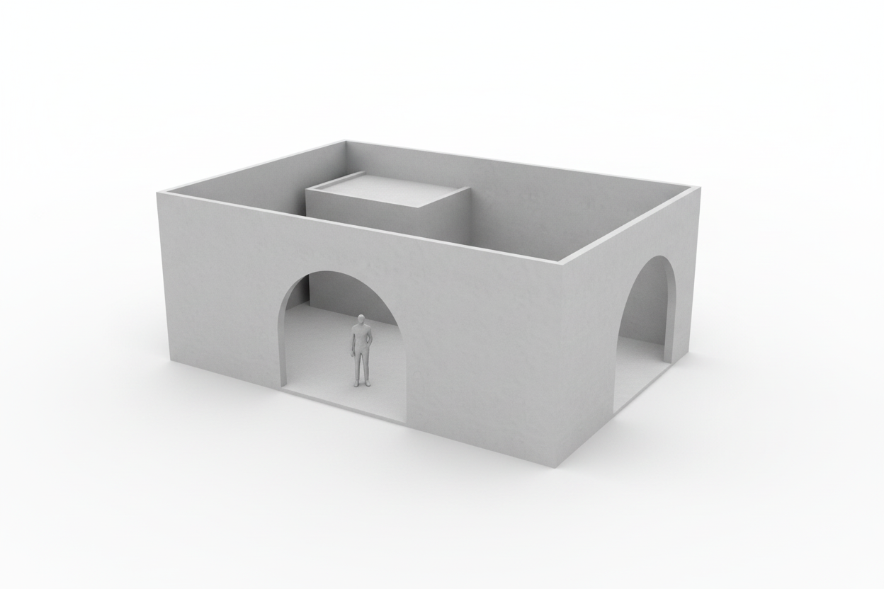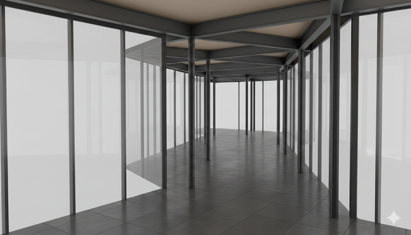 photorealistic architectural interior corridor with realistic material detailing seamless grey porcelain tile flooring with subtle surface variation slight imperfections and natural roughness differences between tiles steel beams columns and frames in dark grey steel with realistic reflections slight tonal variations and soft wear not perfectly uniform clear transparent glass panels with realistic reflections depth and light distortion avoiding flat white surfaces soft natural daylight entering from the sides realistic global illumination stronger contact shadows at the base of columns enhanced depth and contrast high quality pbr materials realistic lighting balance professional architectural visualization ultra detailed but clean modern aesthetic