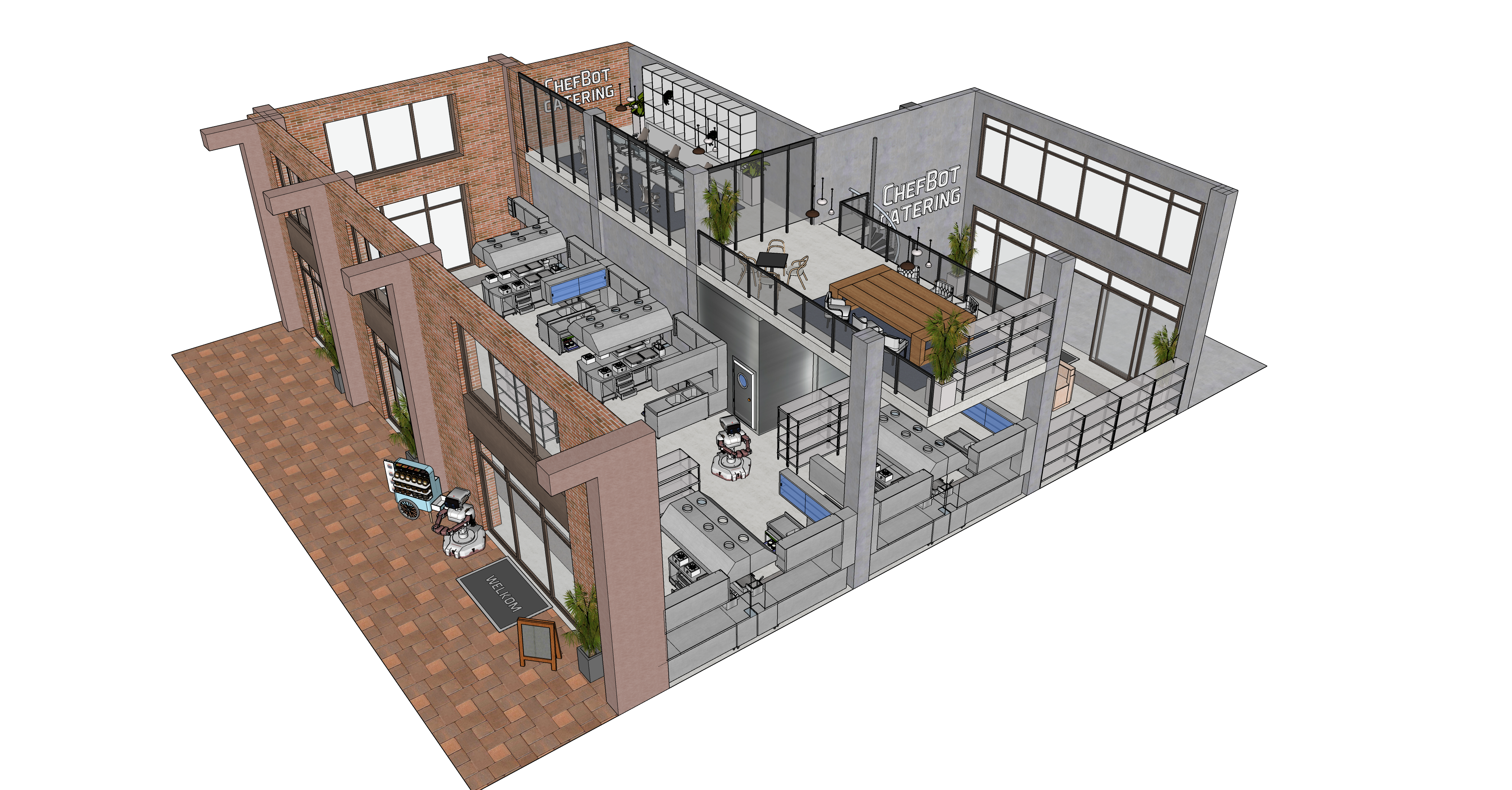 modernist aerial shot modern coworking makerspace catering kitchen warm morning light ambience light tones wooden details architecture