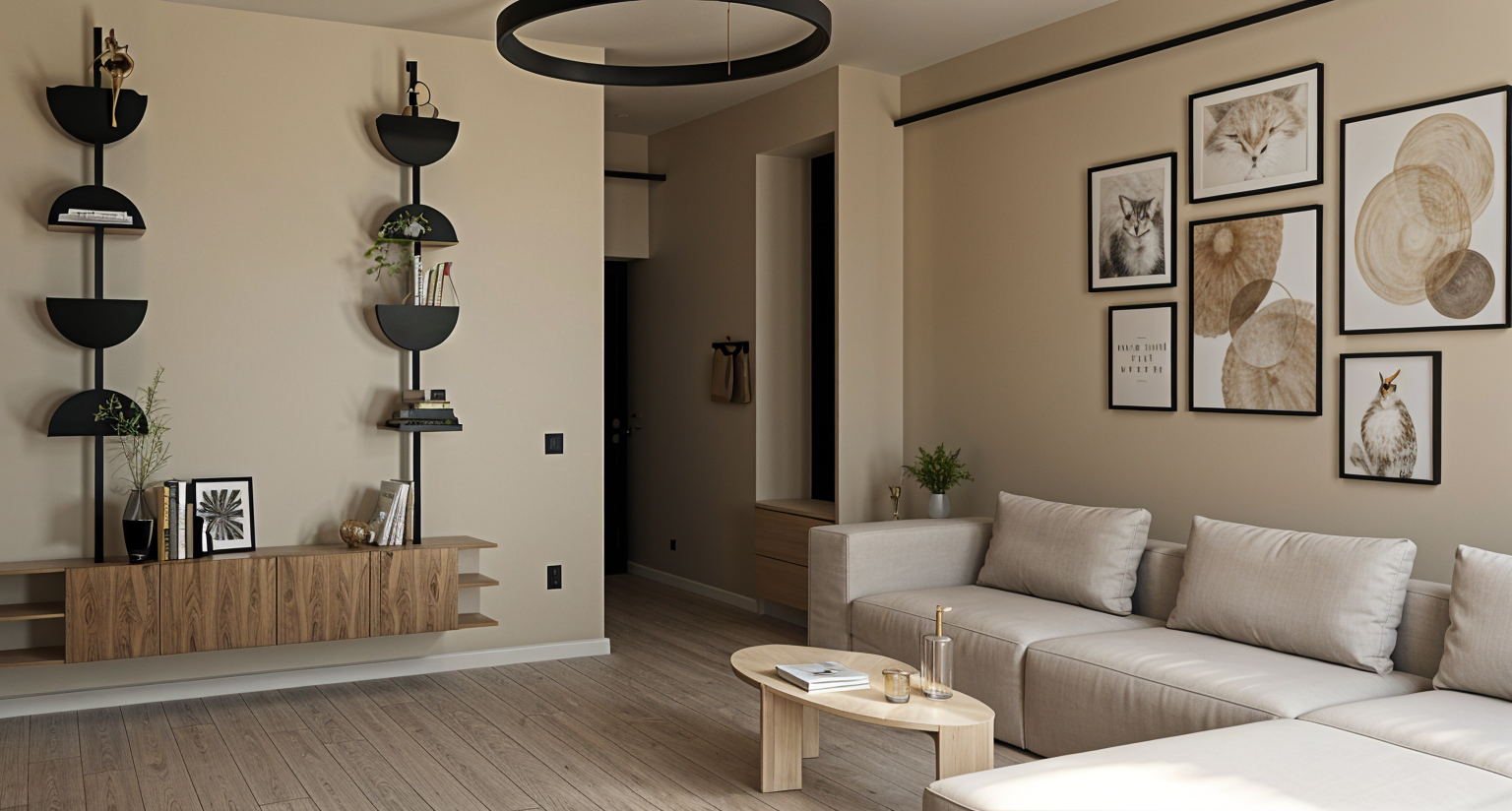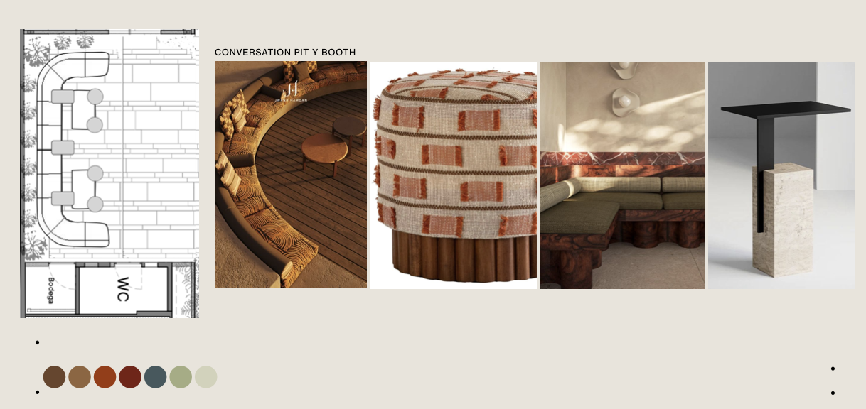 render a modern conversation pit designed with a warm inviting atmosphere use earthy brown tones for the wooden floor and seating complementing it with soft textured cushions in beige and rust orange incorporate beige walls with subtle lighting casting gentle shadows and creating a cozy environment add touches of olive green and blue gray for contrast ensuring a balanced color palette feature a minimalist stone pedestal table with a modern green top adding sophistication to the space capture an ambiance of comfort and modern elegance