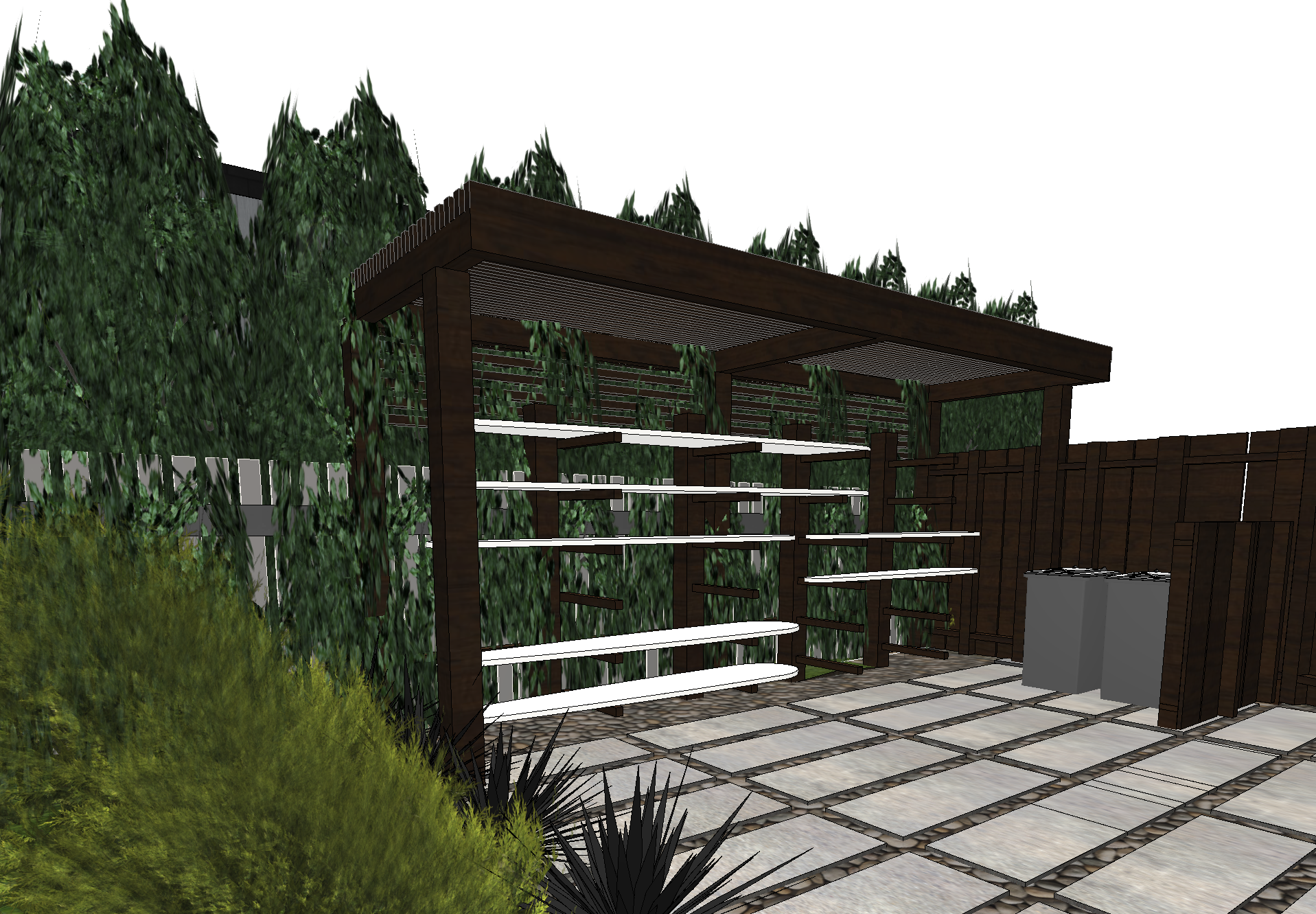 redwood trellis that holds surfboards short boards and longboards blue stone step stones with loose cobble and dymondia inbetween step stones