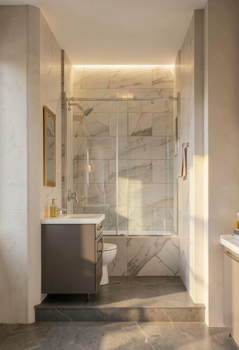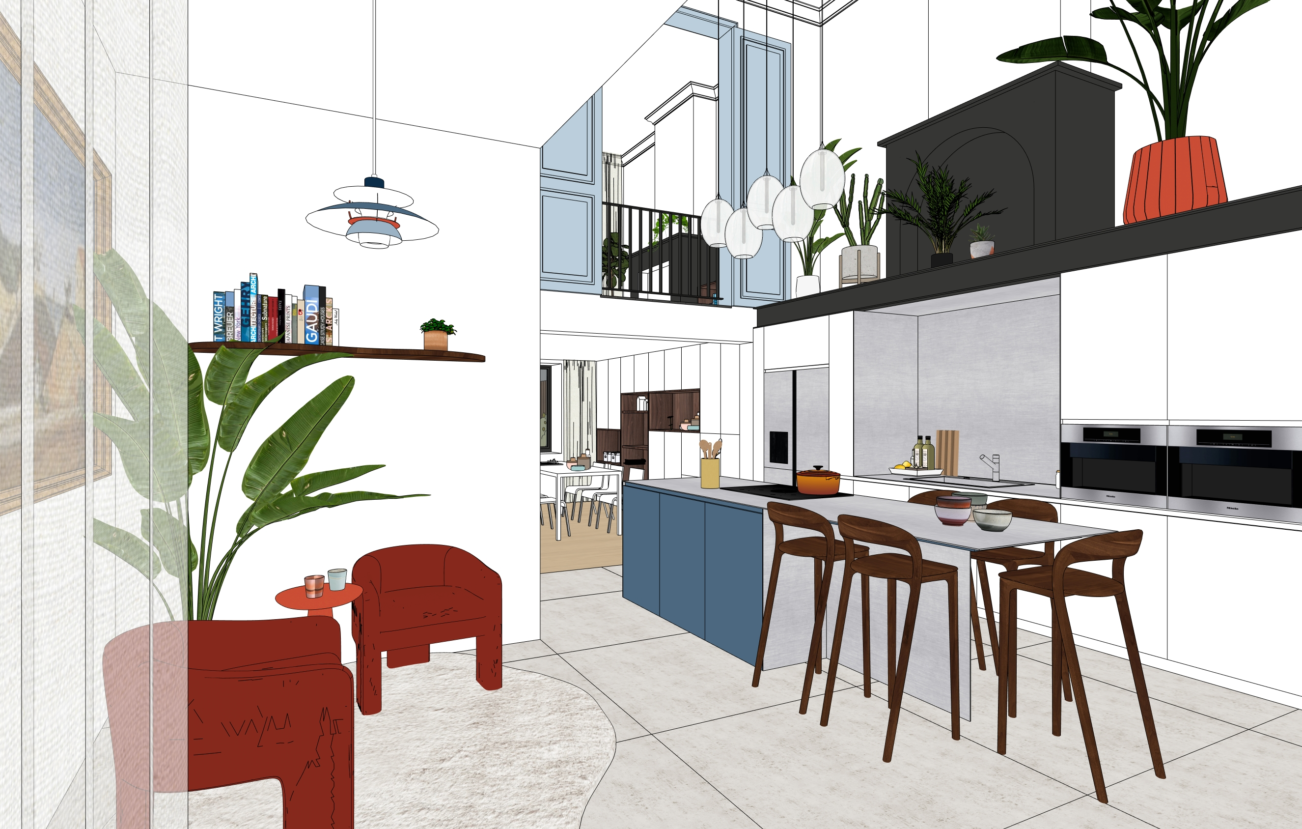 countertops niche kitchen and fridge are inox kitchen floors are concrete tile