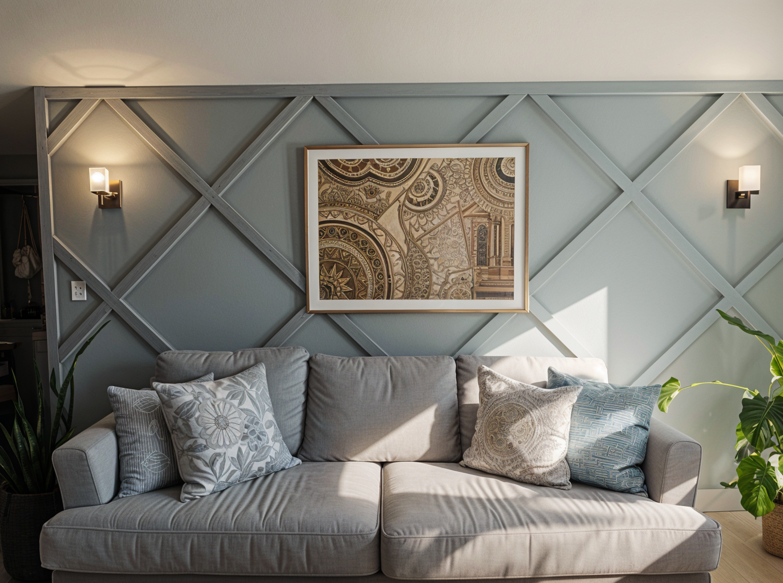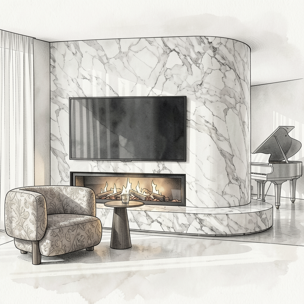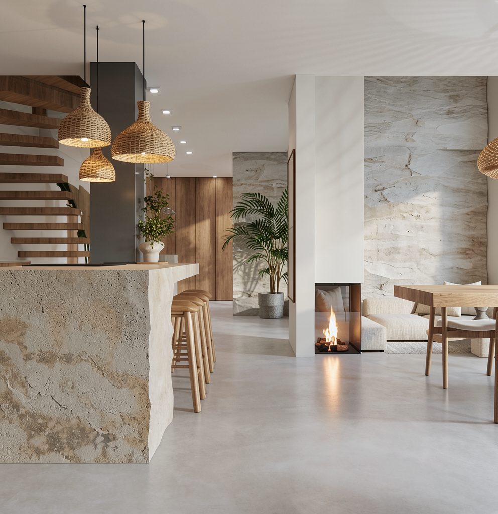 stylish modern interior featuring a minimalist open plan design with soft beige and cream colors highlight a sleek stone bar counter paired with light brown wooden stools above three woven pendant lights cast warm inviting glows a floating staircase in rich wooden tones contrasts against a soft gray accent wall incorporate a cozy fireplace with a flickering flame adding softness to the atmosphere lush green plants add a touch of nature while a wooden dining table and chairs exude warmth and simplicity the overall ambiance is serene and elegant