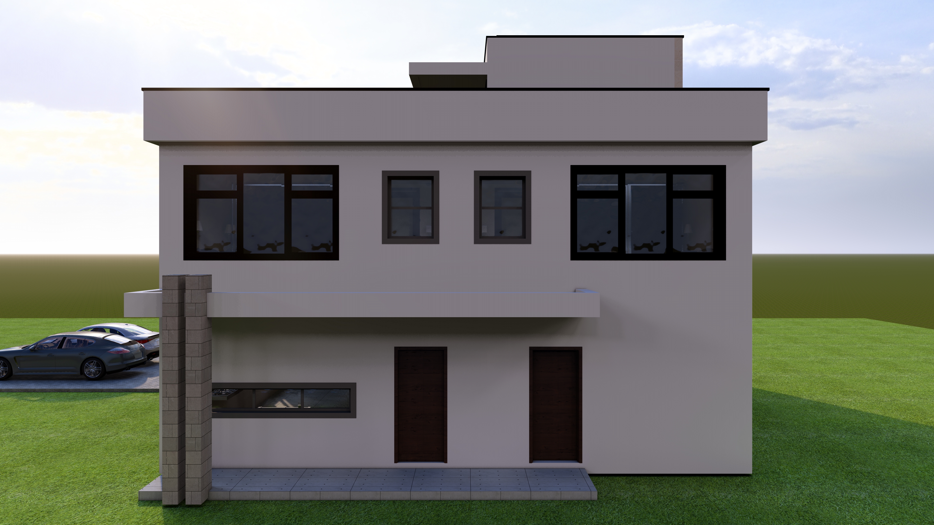 this is a model of a modern townhouse add few trees in background and neat vegetation to give it context add creamish interior warm lighting