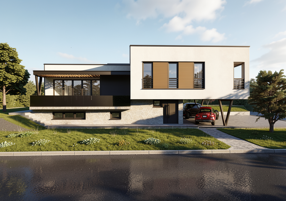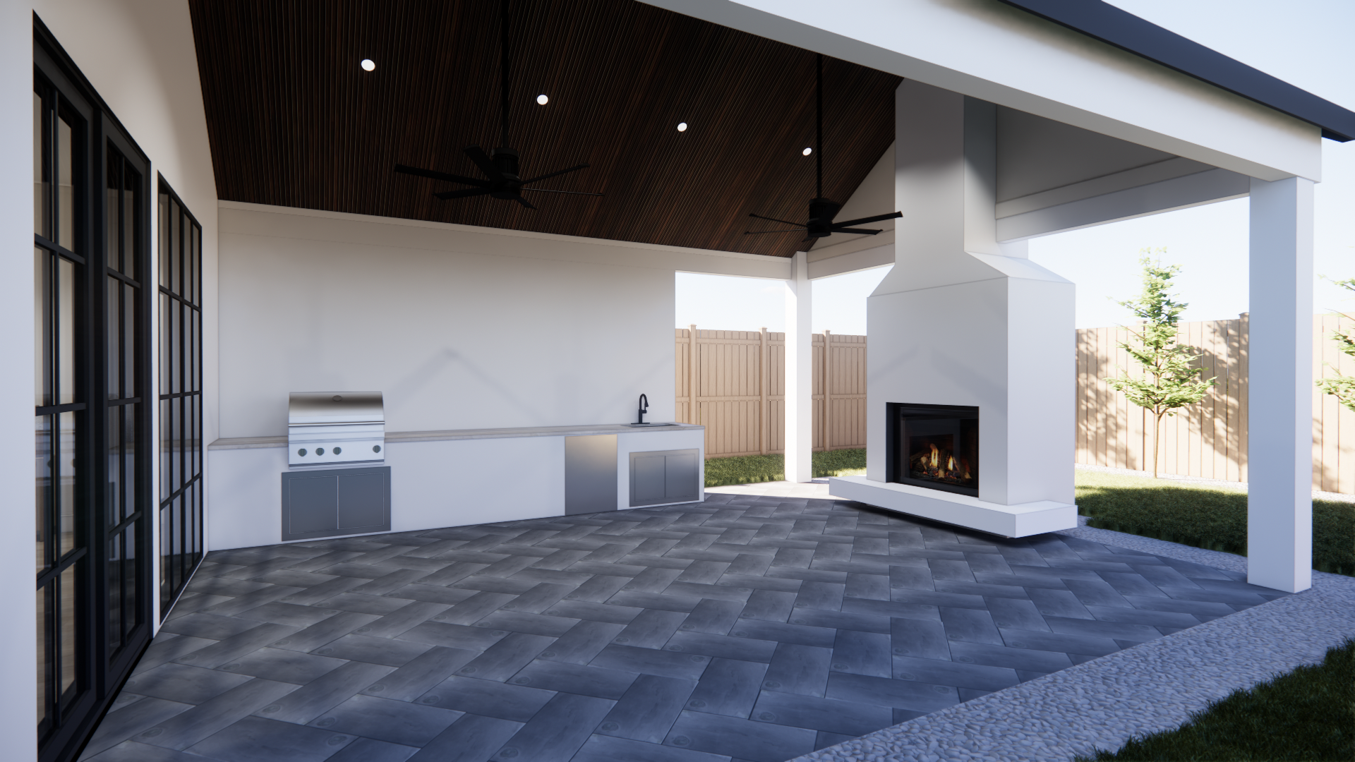 convert this architectural rendering into a highly realistic editorial style luxury outdoor living photograph suitable for marketing and listing imagery maintain the exact architecture layout geometry outdoor kitchen configuration fireplace ceiling design and proportions exactly as modeled do not redesign restyle or modify the architecture in any way do not move walls openings appliances or built in elements enhance realism only through natural lighting accurate material texture subtle reflections and soft shadow depth the final result should feel like a professionally photographed architectural digest style outdoor space used for luxury real estate marketing materials in the space include tilebar 12x24 black slate tile flooring in a herringbone pattern white stucco outdoor kitchen walls and fireplace fluted wood ceiling cladding taj mahal quartzite honed outdoor kitchen countertops outdoor kitchen appliances including 31 grill sink under counter stainless steel refrigerator two stainless steel access doors the black slate tile should appear natural matte and slightly textured with subtle tonal variation and realistic grout lines the herringbone pattern should read clearly with correct scale and alignment the white stucco should appear smooth and refined with a soft plaster like finish showing subtle shadow variation and natural light interaction the fluted wood ceiling should show realistic wood grain depth and shadow between flutes with a warm natural tone the taj mahal quartzite countertops should appear honed with soft movement and warm tonal variation not glossy or artificial stainless steel appliances should show clean reflections and realistic brushed metal texture furnish the space with high end restoration hardware style outdoor furniture the furnishings should feel substantial neutral and refined with soft neutral outdoor upholstery natural wood or teak tones minimal upscale styling furniture should remain proportional and appropriately placed without overcrowding the space the overall styling should feel elevated calm and resort like while still allowing the architecture and materials to remain the focus lighting should include soft natural daylight with gentle outdoor shadows and realistic light falloff the lighting should feel balanced and editorial not harsh or overly dramatic the final image should appear crisp photorealistic and editorial similar to a professionally photographed luxury outdoor living space avoid warped or exaggerated wide angle distortion the perspective should feel natural as if captured by a professional architectural photographer with straight vertical lines and balanced proportions do not alter architecture layout geometry materials or built in elements only enhance realism and add furniture styling