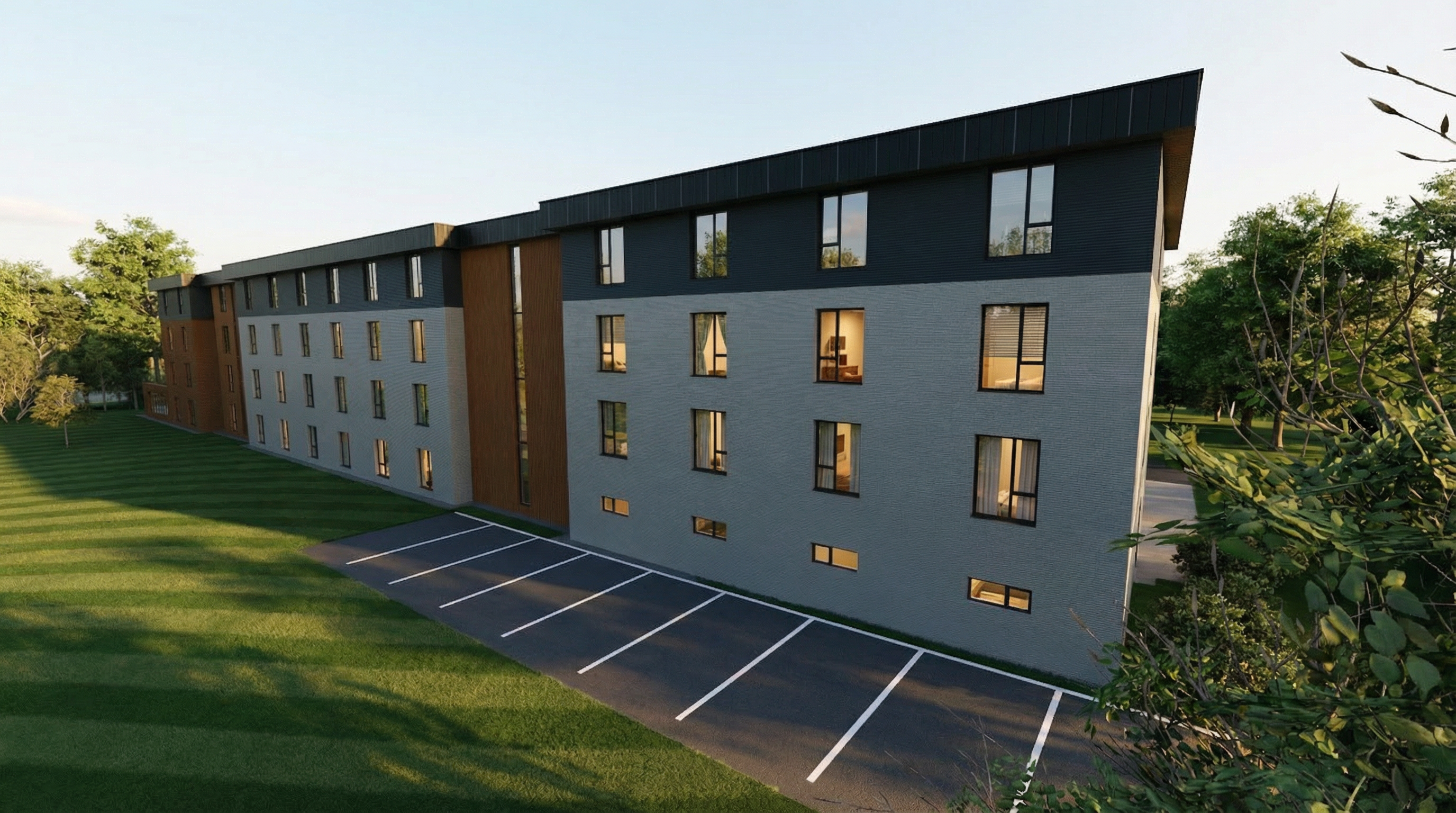 create a photorealistic render of a children s bedroom the furniture has light beige solid parts in egger u707 st9 decor the slanted panel running from the bed up to the upper cabinets is also finished in egger u707 st9 decor the dark green parts of the furniture are upholstered with a soft fine textile texture in a petrol deep teal green shade all upholstered elements should look soft comfortable and padded the bed contains two mattresses the bed is dressed with a bedsheet pillow and duvet styled in a casually made relaxed way place toys for a small boy on the shelves toy cars and children s books on the bedside table add a modern minimalist lamp the floor is a natural oak wood finish the scene is bright and airy with daytime natural sunlight creating a warm and calm atmosphere style ultra realistic high detail soft natural lighting clean contemporary interior design realistic materials and textures