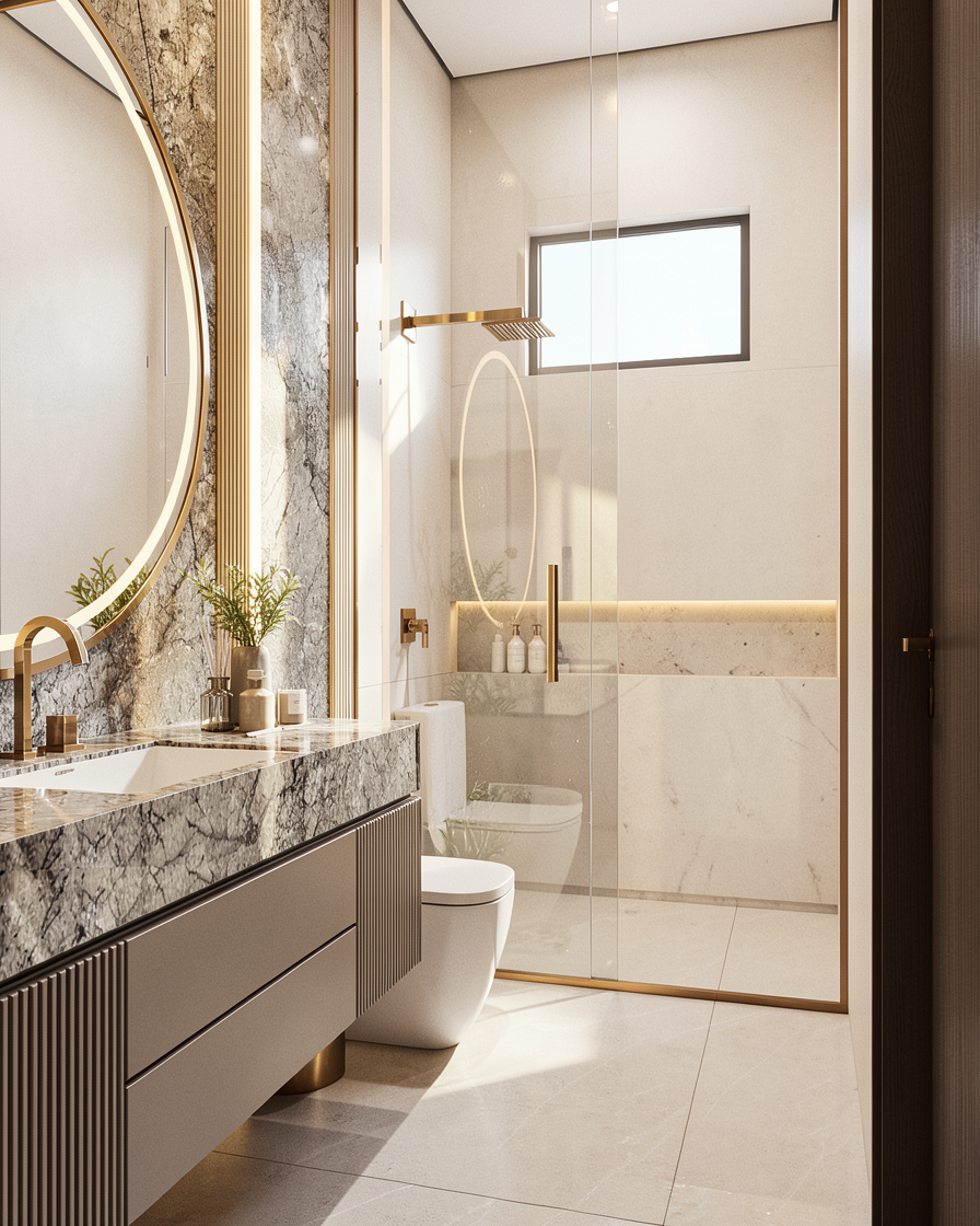 make this look like a photo realistic rendering the vanity is white the tiles are white polished finish with light horizontal vein